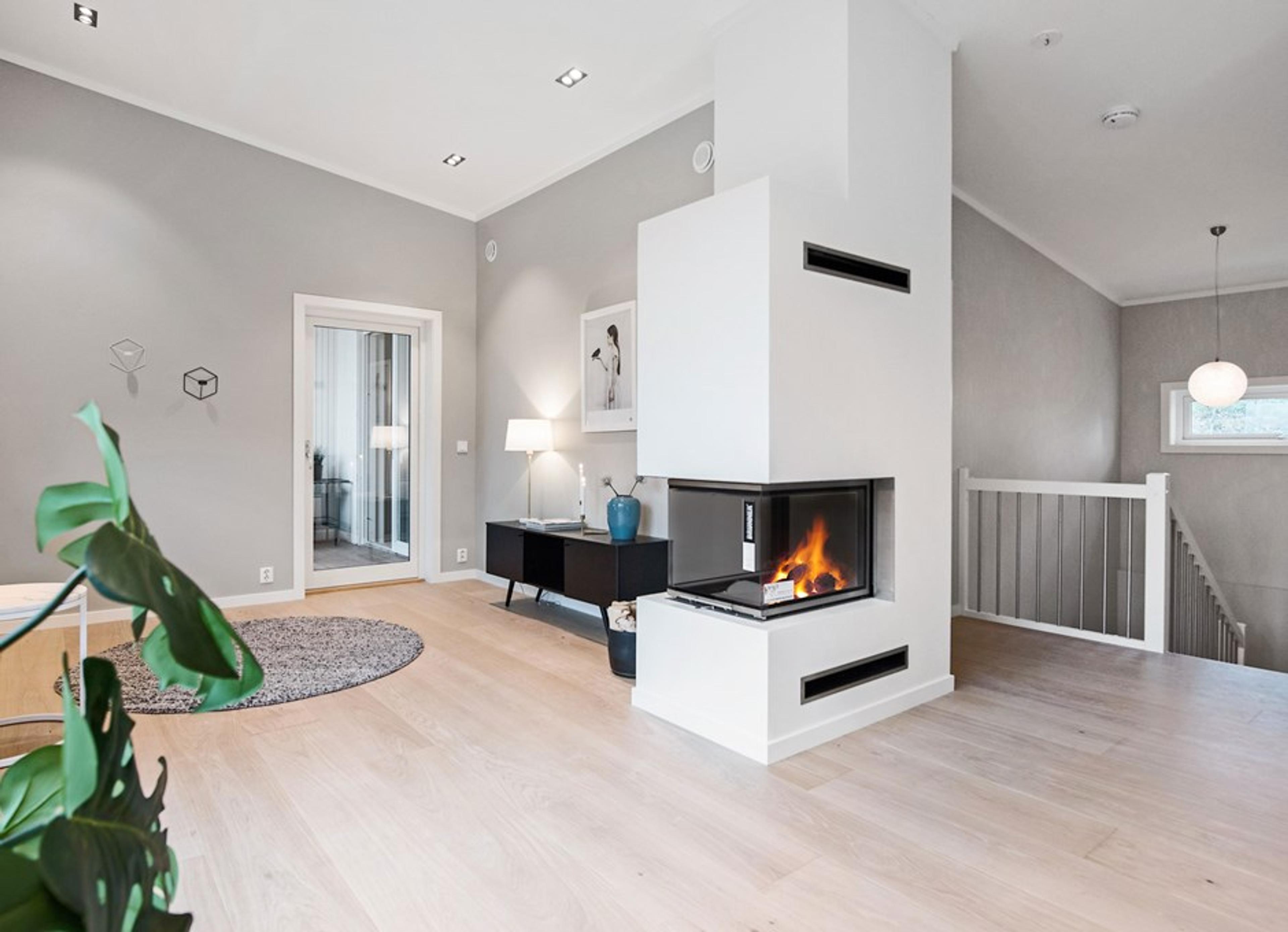 Det store, åpne allrommet på øvre plan blir ekstra koselig med en lekker peis. Plasseringen sørger for at den er godt synlig fra flere soner i rommet. Enten du spiser middag med familien, eller slapper av i sofaen.