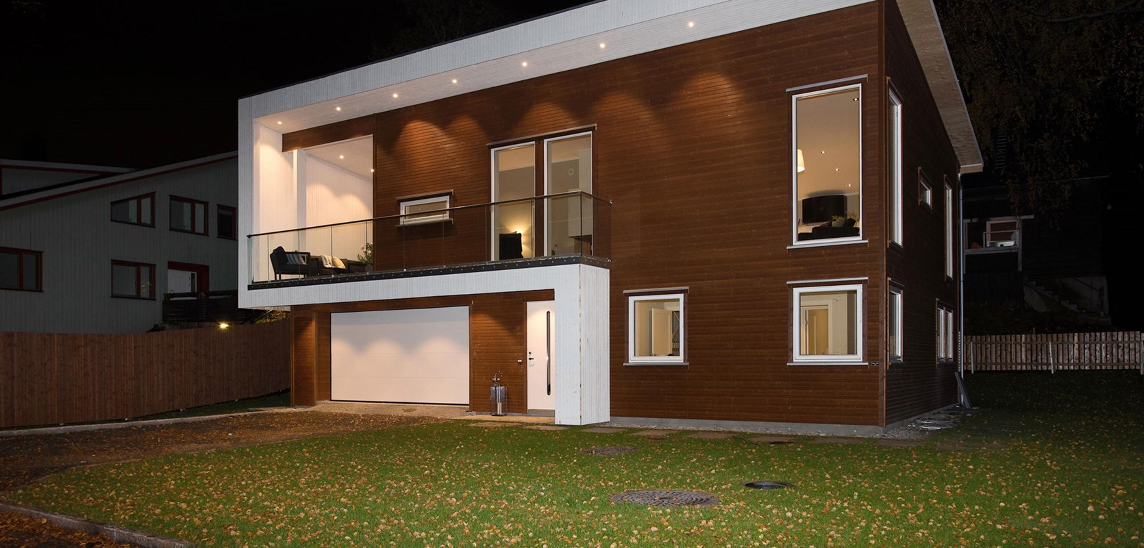 Integrerte downlights sørger for en fin og stemningsfull belysning, både på den trivelige og overbygde hjørneterrassen, over garasjen og selve inngangspartiet.