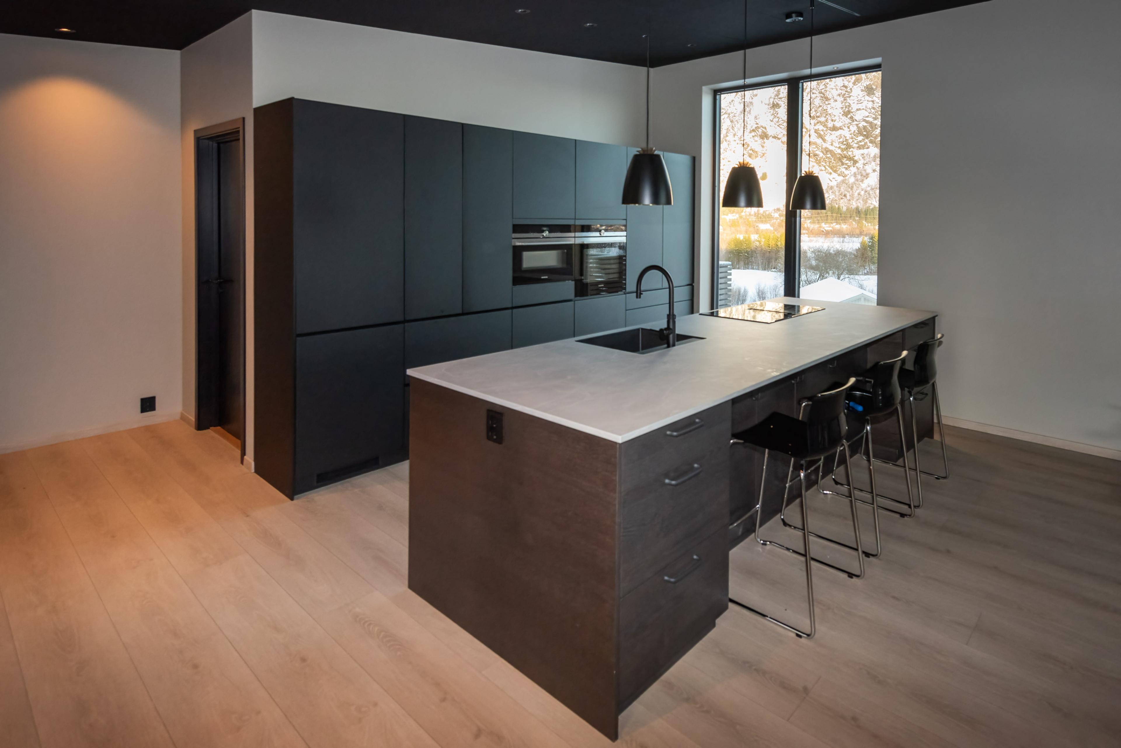 - Vi hadde en ganske klar formening om hva vi ønsket oss av type kjøkken, gulv, vegger etc. Så var det bare å finne noe som matchet dette til en pris vi kunne leve med. Eirik brukte mye tid på å lete opp gode tilbud på diverse materialer og innredning som vi kjøpte selv. Badet var det vi brukte lengst tid på å avgjøre i forhold til flis og innredning. Ellers falt det meste på plass nærmest av seg selv. Vi fant også idéer på Instagram, som f.eks aluminiumsplatene fra Alutile.