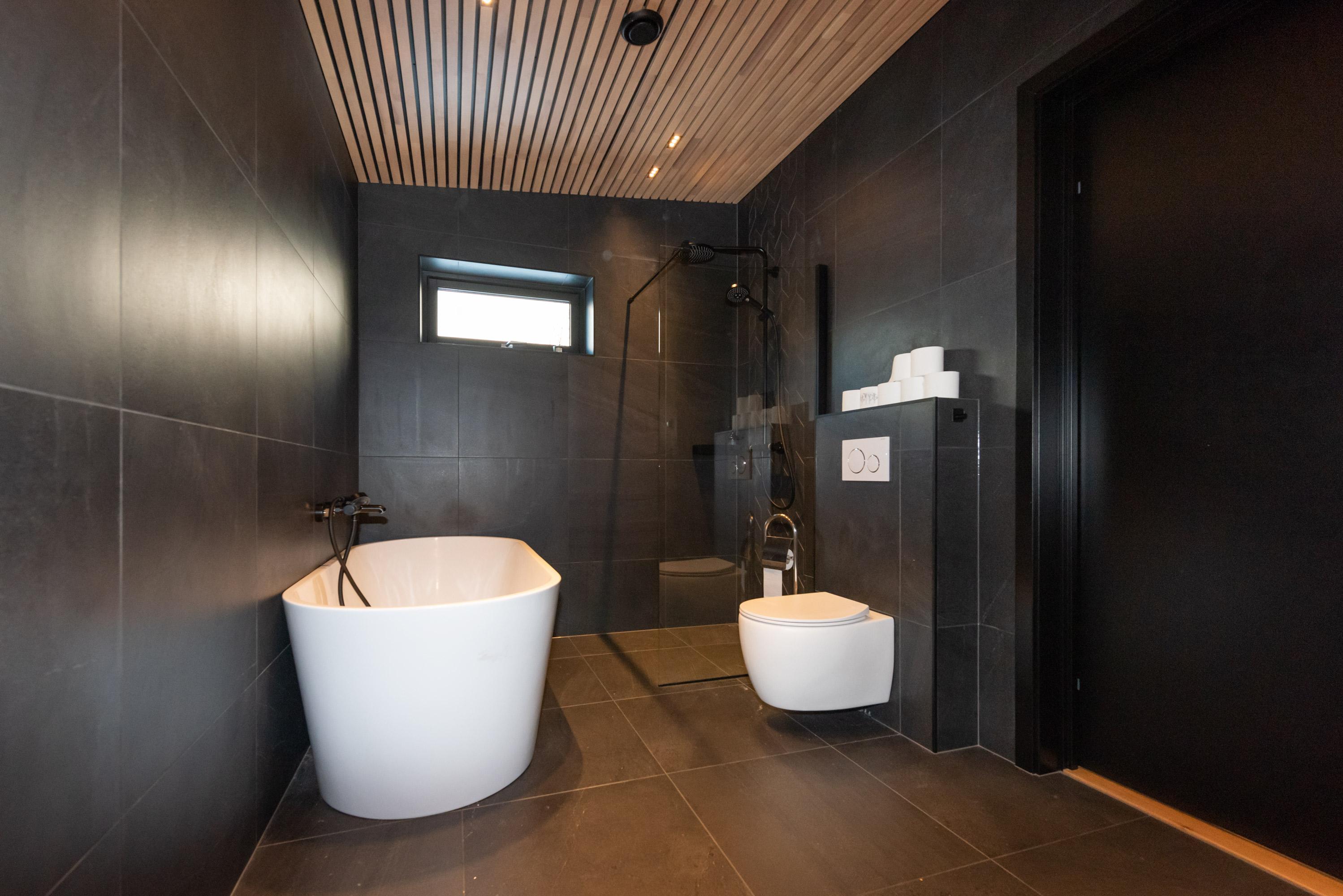 Lekkert bad med store mørke fliser på gulv og vegg. Trespilene i taket gir det lille ekstra og en god atmosfære i rommet.