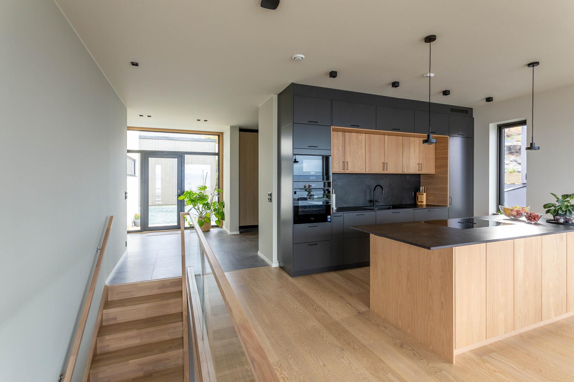 Kjøkkenet kombinerer stil og funksjonalitet, med harmoniske tretoner, rene linjer, store vinduer og sømløs overgang til uteområdet.