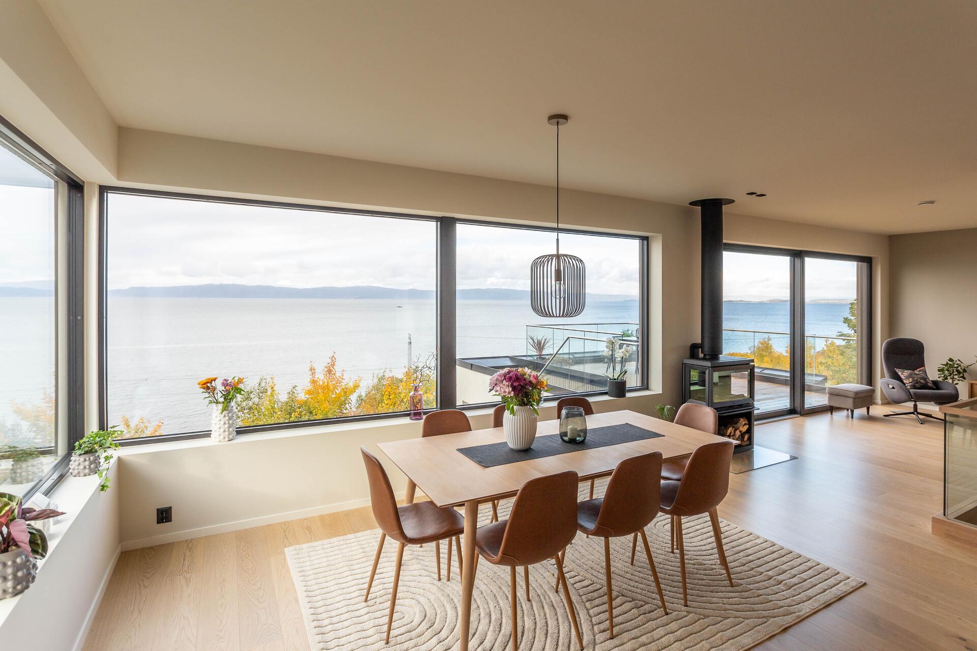 Dette arkitekttegnede huset er et resultat av nøye planlegging og tilpasning. Hjemmet utnytter tomtas beliggenhet fullt ut, med spektakulær utsikt fra flere rom, en praktisk utforming og hensyn til naboenes utsiktslinjer.