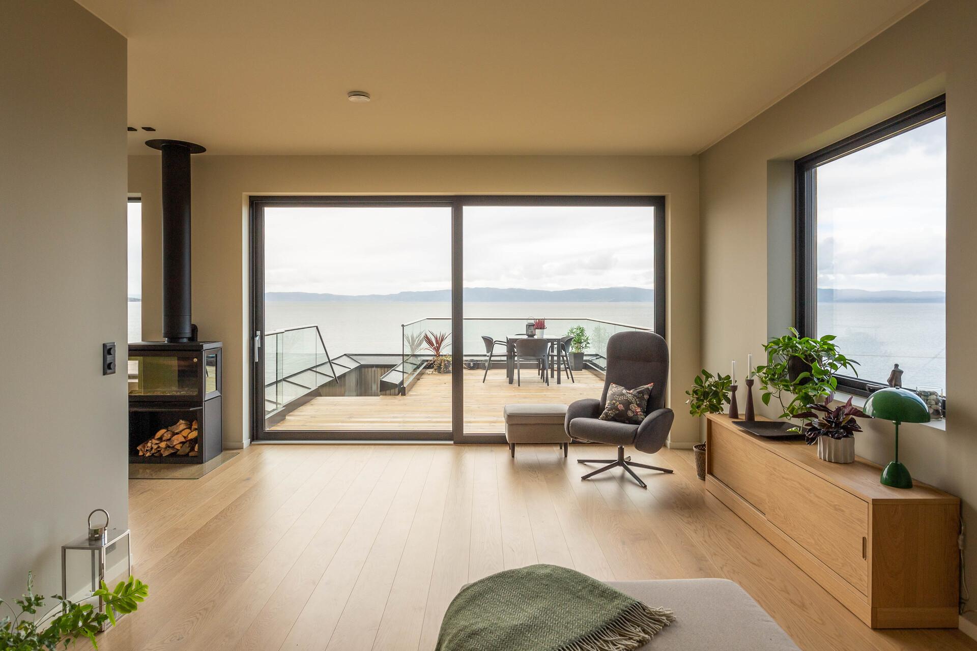 Stuen åpner opp mot en fantastisk takterrasse med utsikt over sjøen, som gir en luftig og avslappende atmosfære.