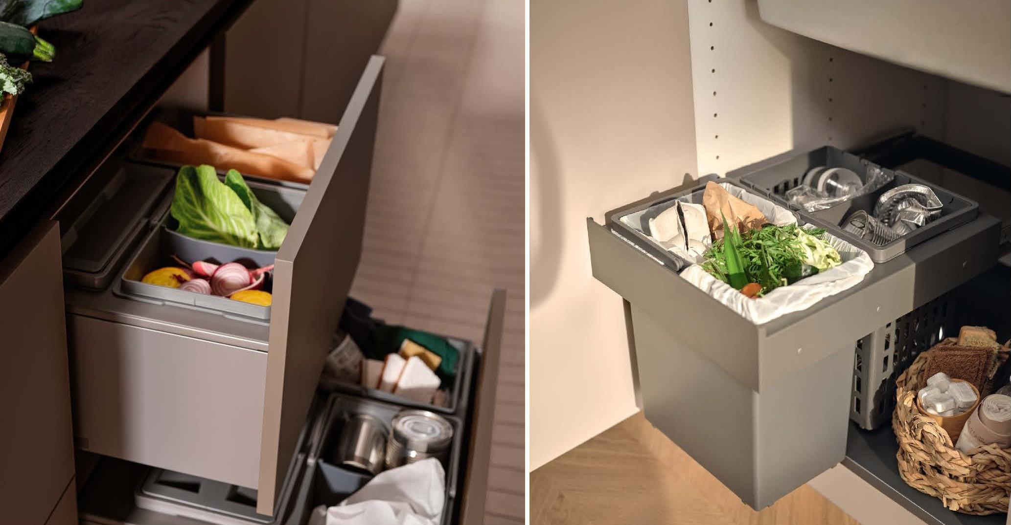 Avfallssortering i skuffeløsning (venstre) og avfallssystem i skap (høyre) fra HTH.