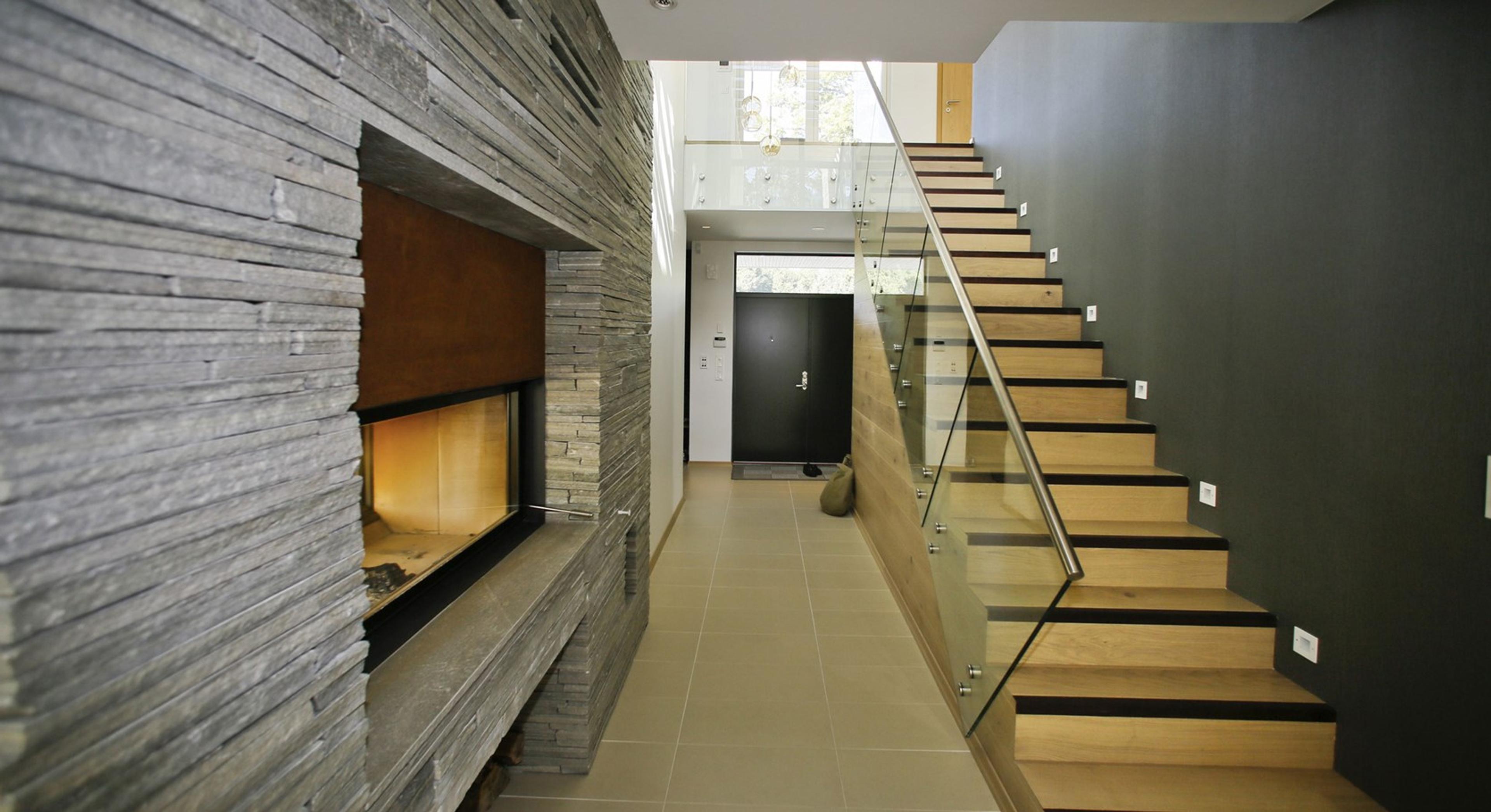 Peisene i skiferstein var viktige for Hanssen, og han la inn ønsket om en tosidig peis som man kan se rett gjennom fra hallen til stua.