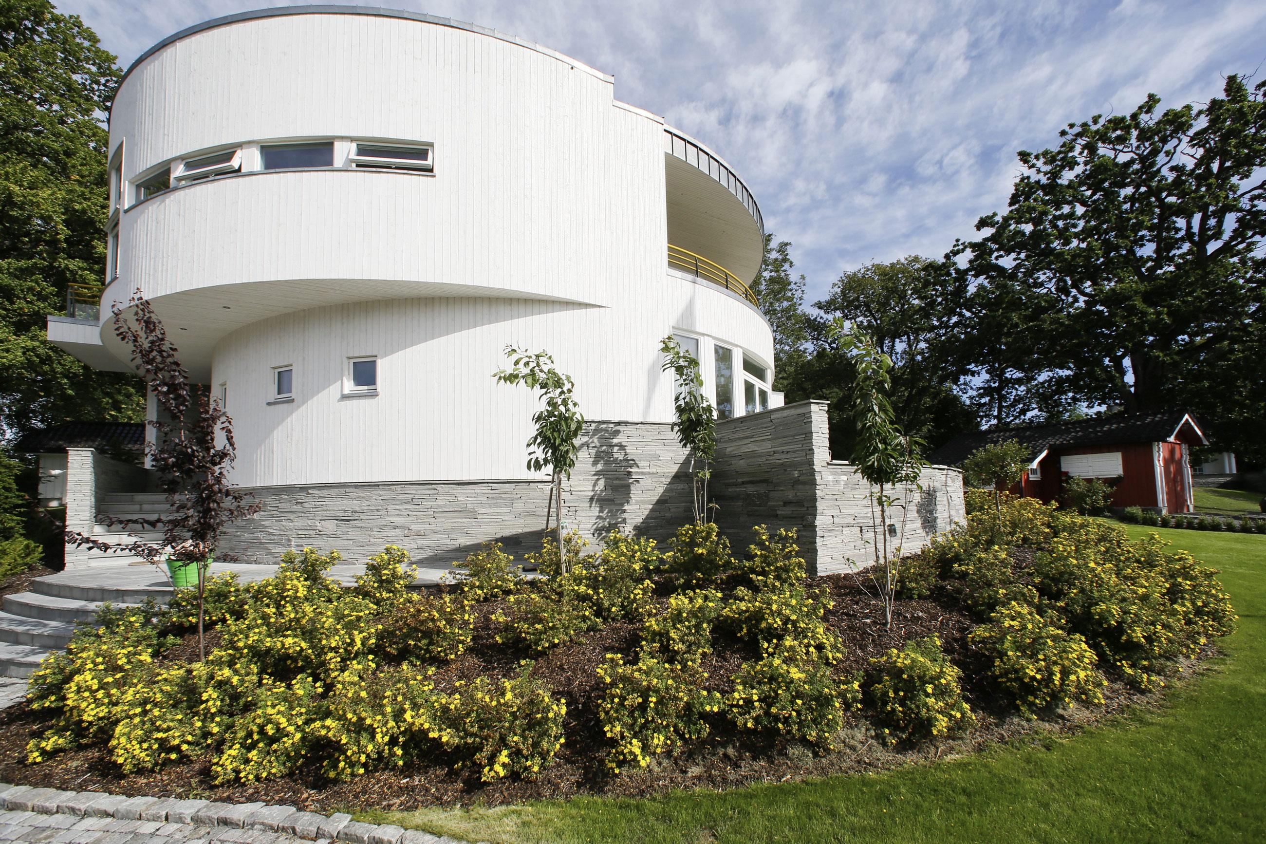 Arkitektens visjon har resultert i et storslagent hus på drøye 325 kvadratmeter med buet fasade satt sammen av to sirkler som overlapper hverandre, tydelig inspirert av den modernistiske stilen på 30-tallet.