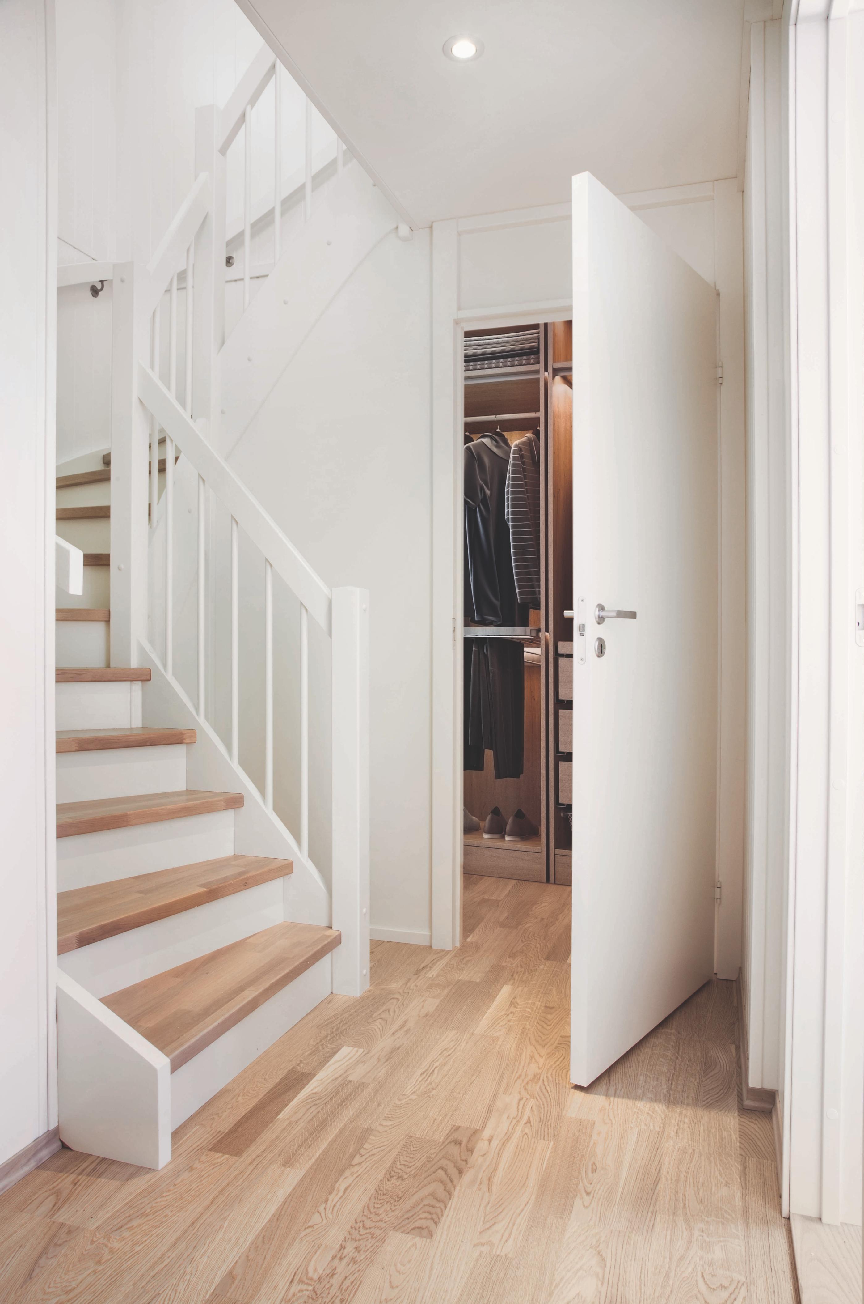 Bod under trappa er en smart løsning til en tett svingtrapp. Rommet under trappa kan brukes som et lite minikontor eller som et sted der du oppbevarer klær som ikke trenger å henge framme. Mulighetene er mange!