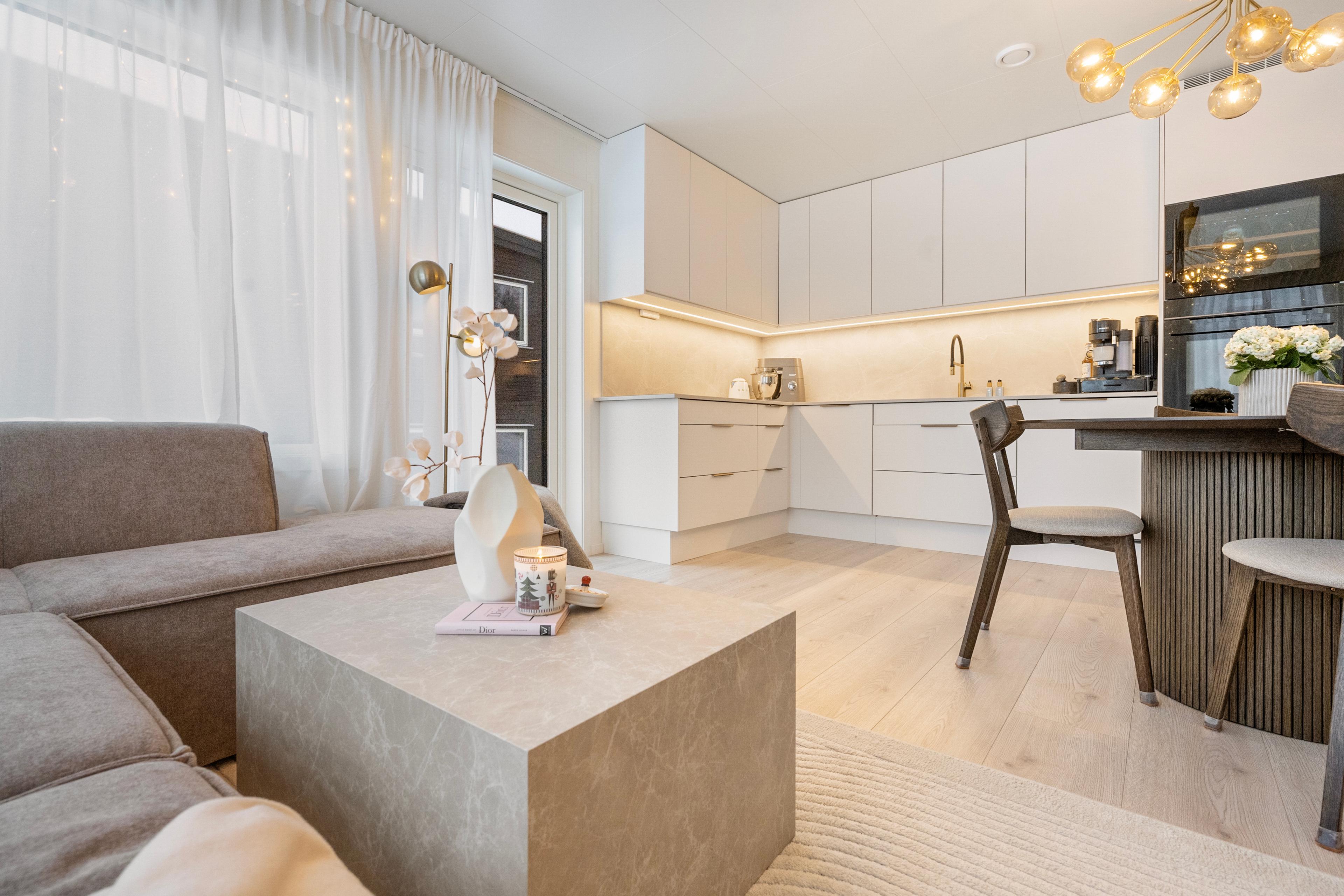 Den åpne stue- og kjøkkenløsningen skaper en sosial og romslig atmosfære.