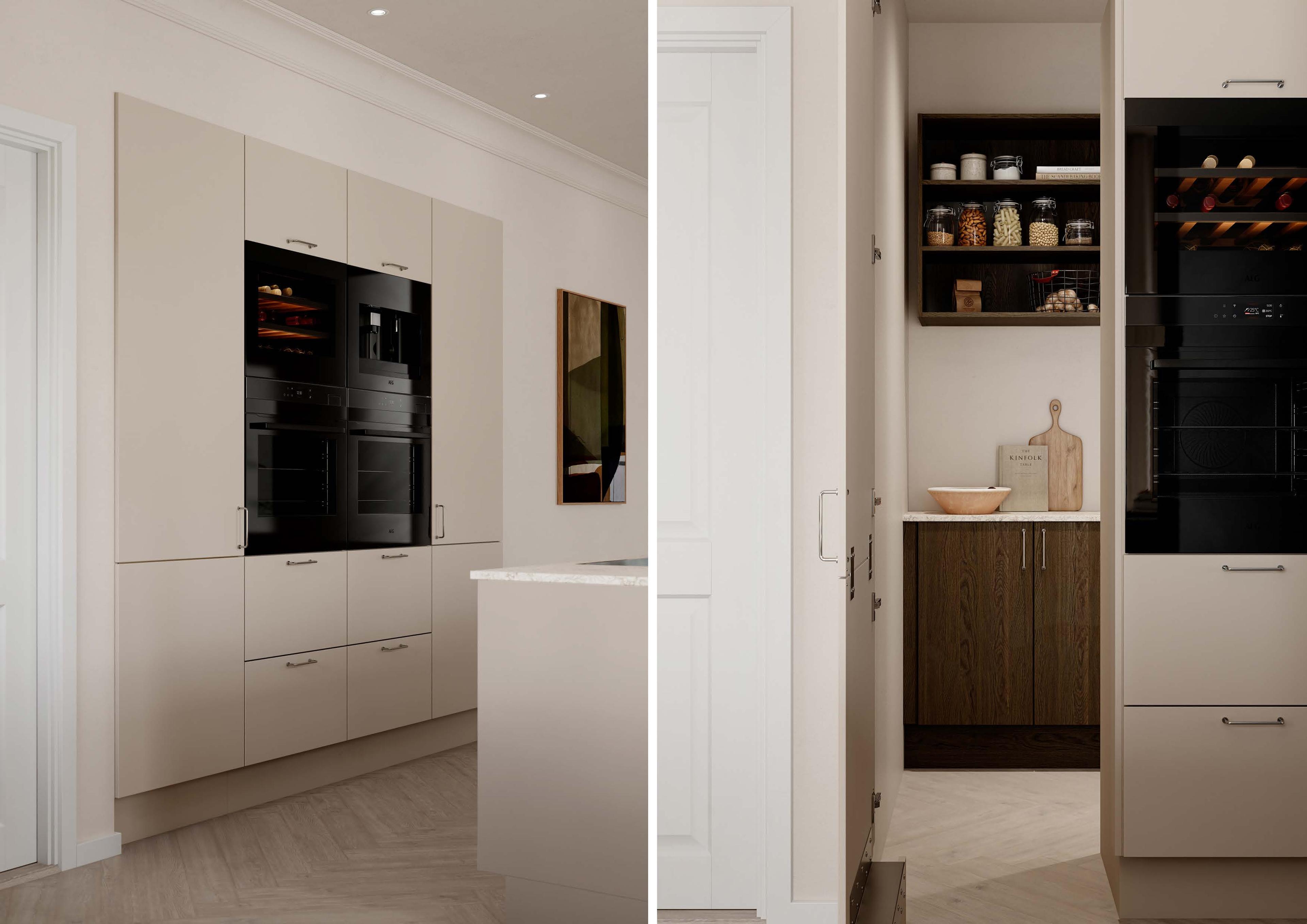 Ovn med «slide and hide»-funksjon fra NEFF (venstre) og integrert kjøleskap fra AEG med Base-dører fra HTH (høyre).
