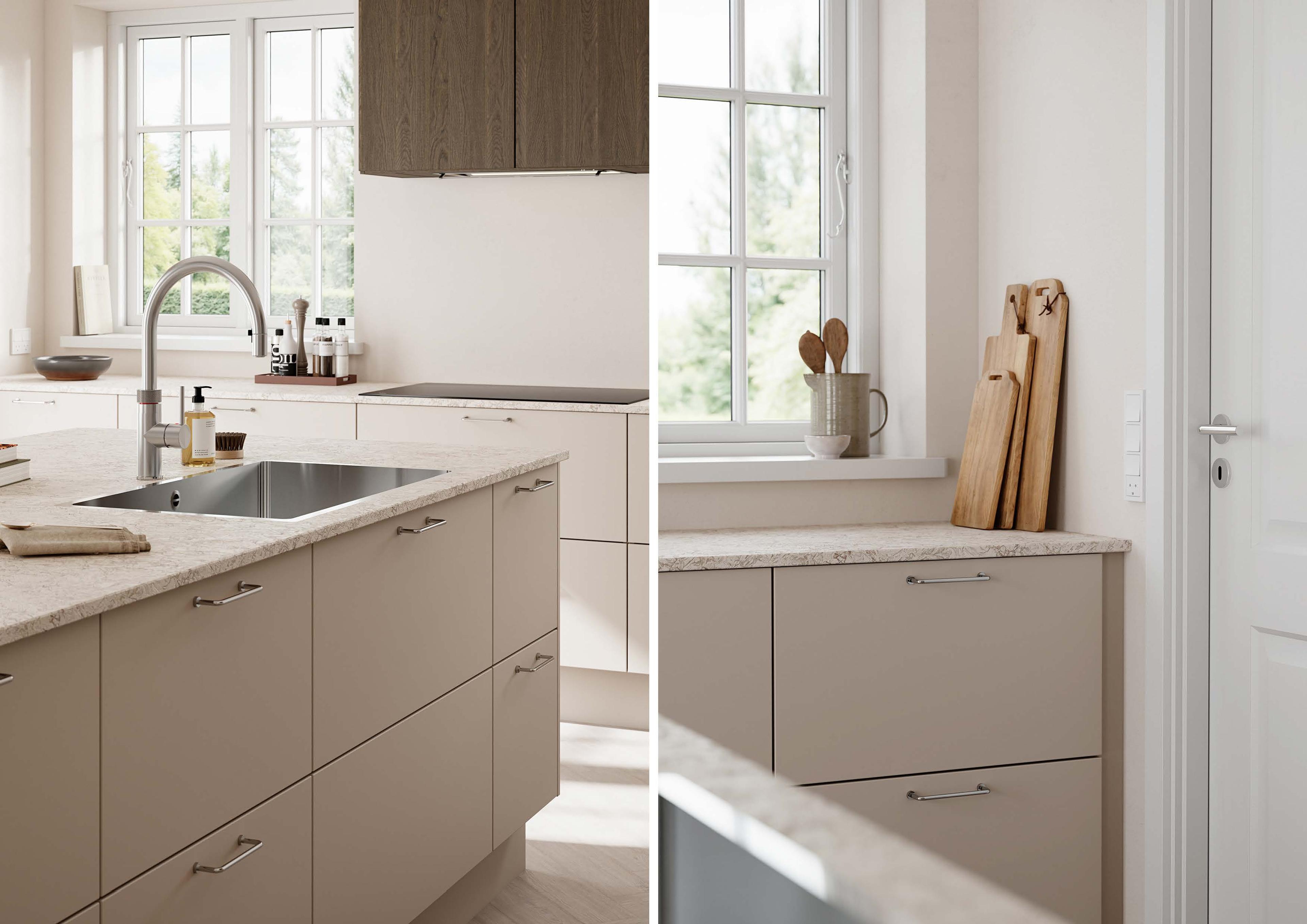 I 2025 blir kjøkkenet et rolig og harmonisk fristed der varme og naturlige farger skaper en innbydende stemning. Nøytrale nyanser som jordfarger, beige og den moderne «greige» dominerer og byr på tidløs eleganse. Samtidig fremhever materialer som stein, keramikk og eik den naturlige estetikken og gir kjøkkenet en taktil og eksklusiv følelse.