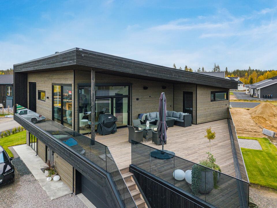 Opplev det moderne designet til denne store eneboligen med en spennende og stram fasade, preget av rene linjer og store vindusflater. To balkonger og terrassen er omgitt av glassrekkverk, som skaper en spennende kontrast til den liggende kledningen i tre.