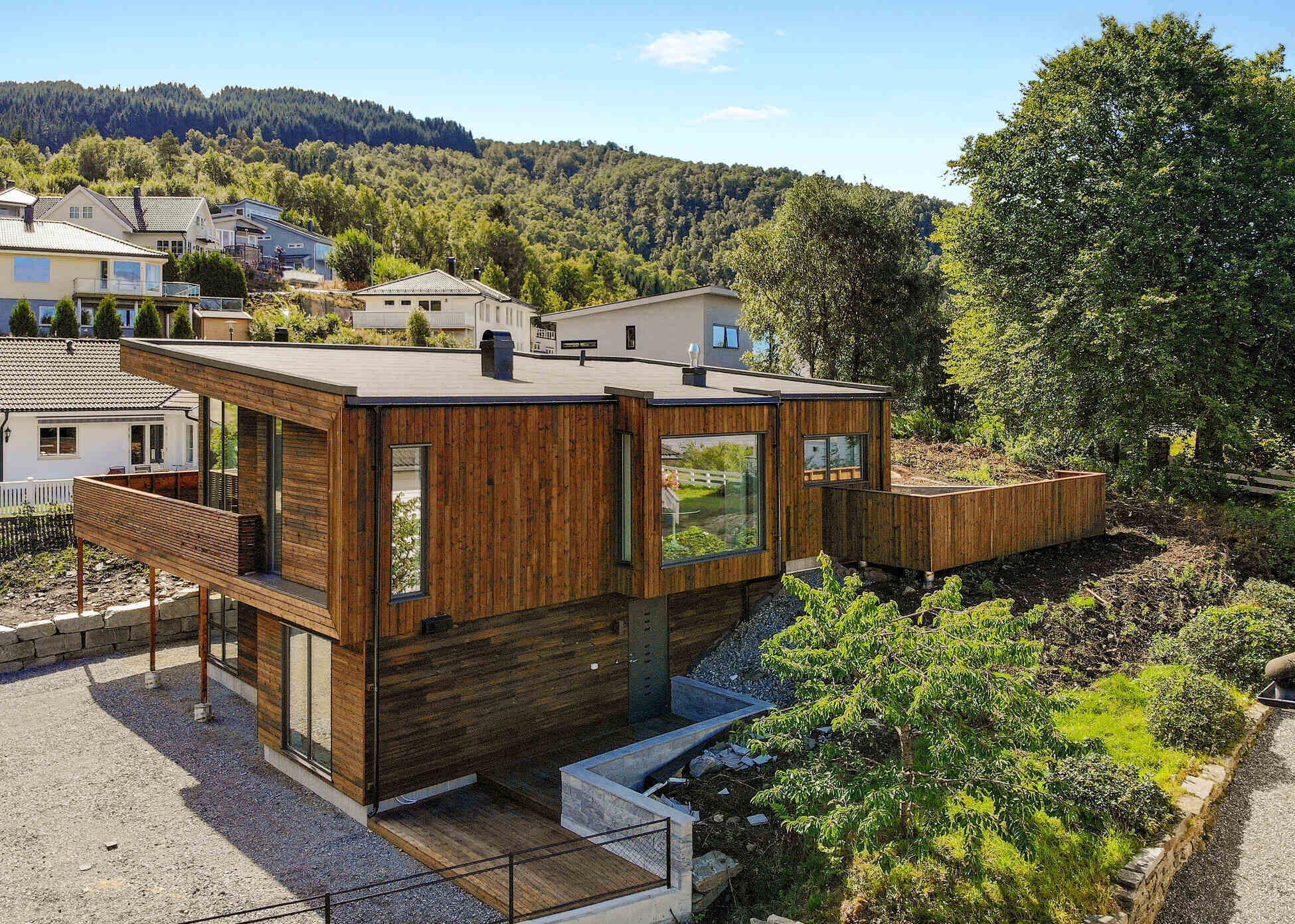Signatur 306 er tilpasset skrå tomt, og hovedinngangen ligger på øvre plan, med kort vei til carporten. Rett ved siden av inngangen har du direkte adkomst til en utvendig sportsbod. Huset har også en stor, flott terrasse tilgjengelig fra stuen.