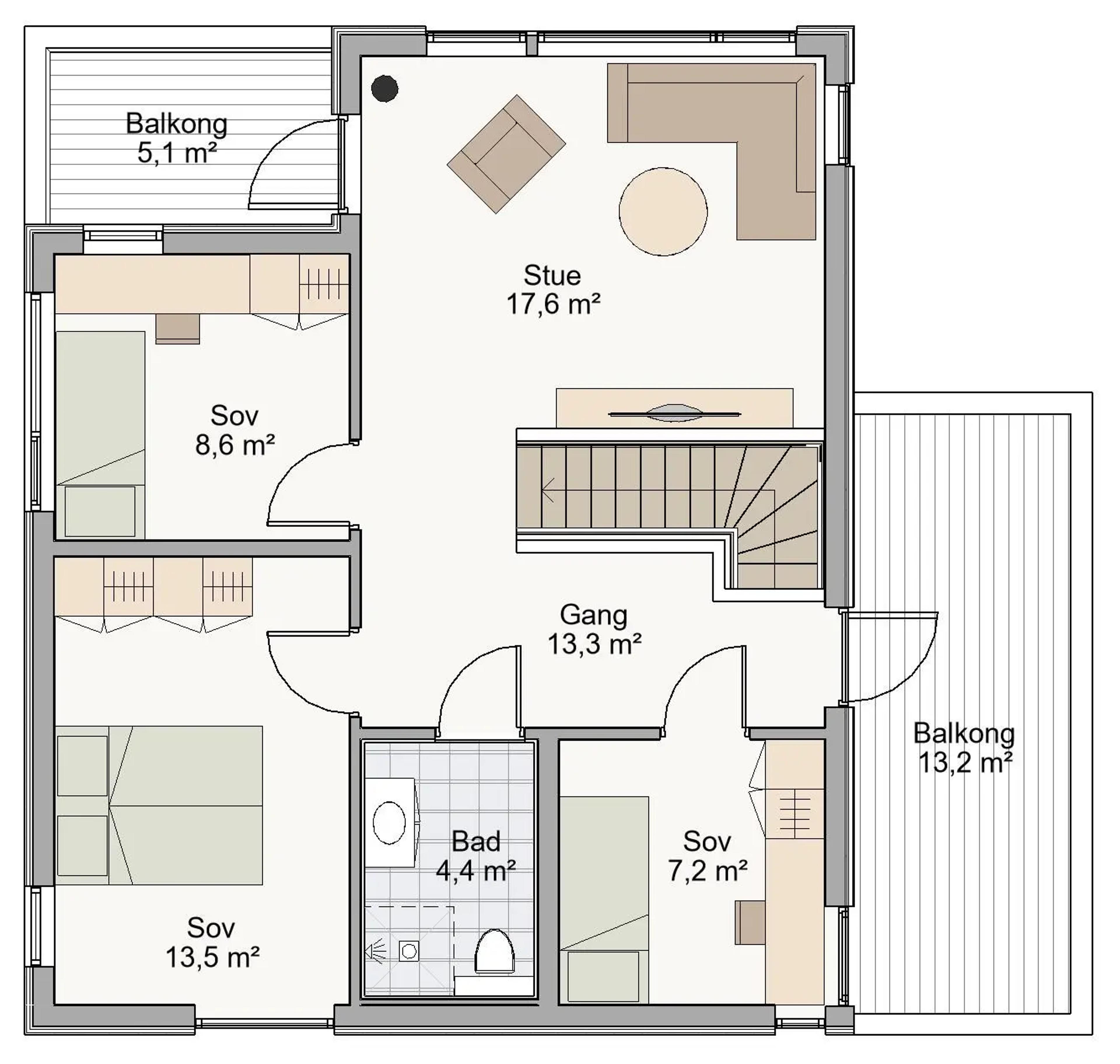 Huset har pulttak og skrå himling, slik at man i andre etasje får en flott takhøyde på loftstuen. Det er to balkonger ut ifra andre etasjen, slik at man kan velge hele dagen om man ønsker å følge sola eller skyggen. Balkongen ut fra loftstuen er overbygd og har vegger på to kanter. Det gjør balkongen lun og fin. Glassrekkeverket gjør at den allikevel føles luftig. Andre etasjen har også tre soverom og et bad.