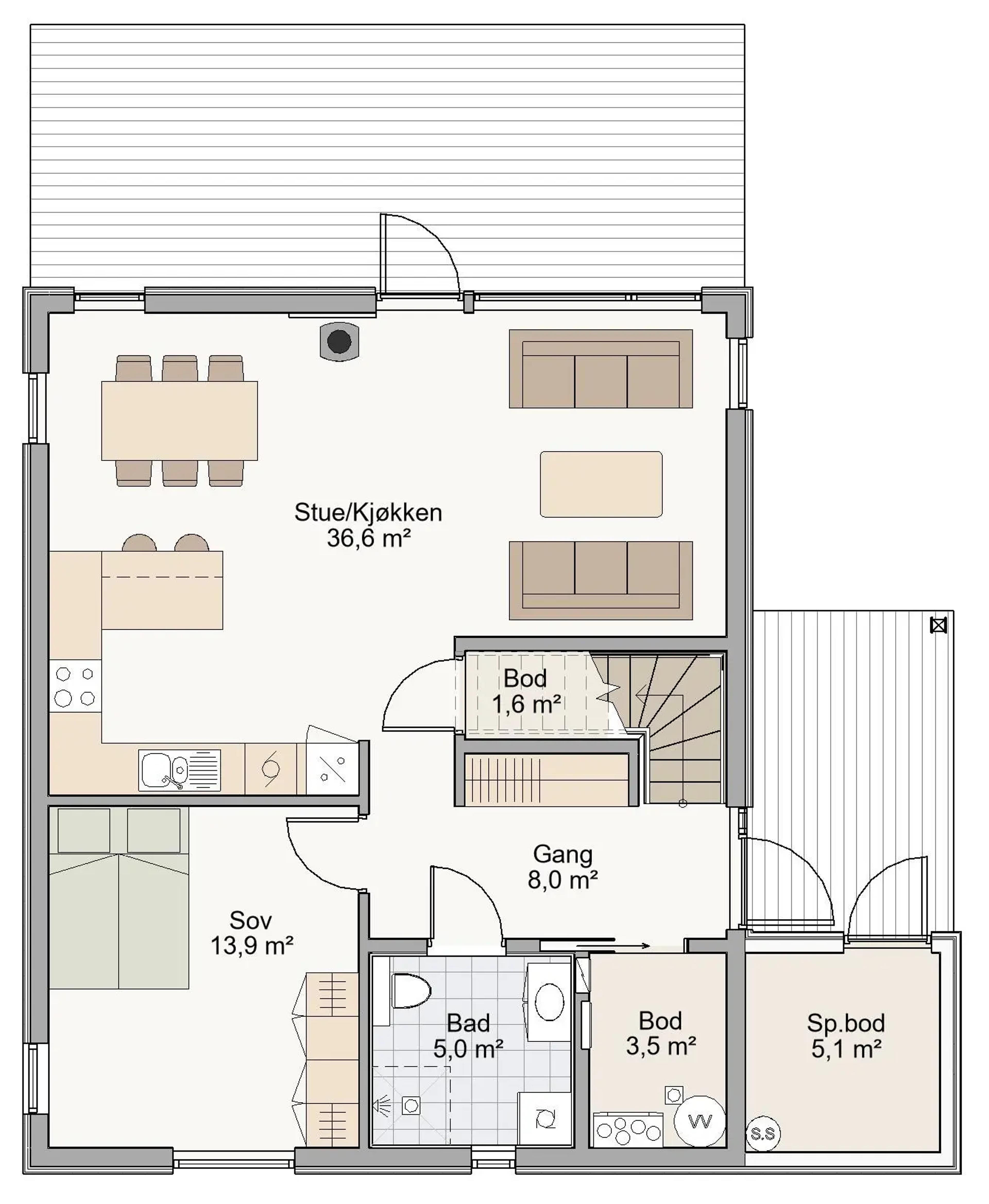 Skansen har et praktisk overbygd inngangsparti, med sportsbod rett utenfor hoveddøren. Dett gjør det lett å sette fra seg barnevogn eller andre ting som ikke trenger være med inn i huset. Rett innenfor døren er det også en bod. Videre kommer du inn til en romslig stue med utgang til terrasse. Det er plass til peis midt mellom spisestuen og stuen, slik at man kan få glede av den uansett hvor man sitter. Huset har et romslig L-formet kjøkken, med mulighet til å bygge på en bar-løsning. Etasjen har også et stort soverom og et bad.
