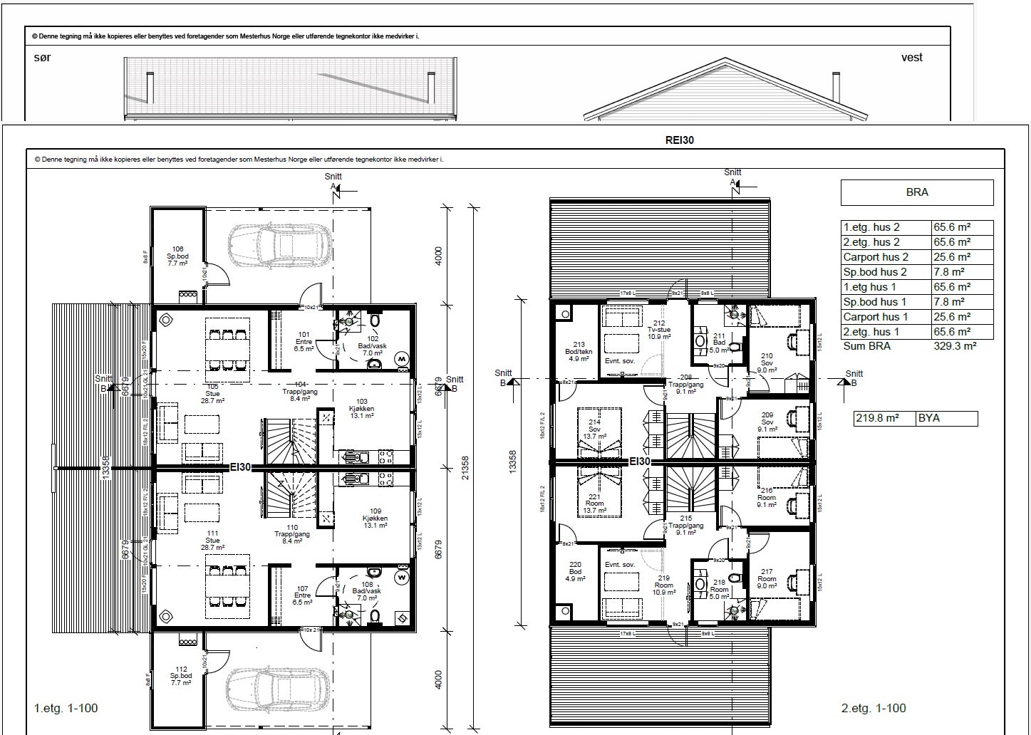 Boligene går over to fulle plan, har en god planløsning og fremstår i moderne stil. Optimale solforhold med både markterrasse ut fra stue og takterrasse over carport/garasje. Carport/garasje er beregnet for 1 bil og det er god plass i tilliggende sportsbod.