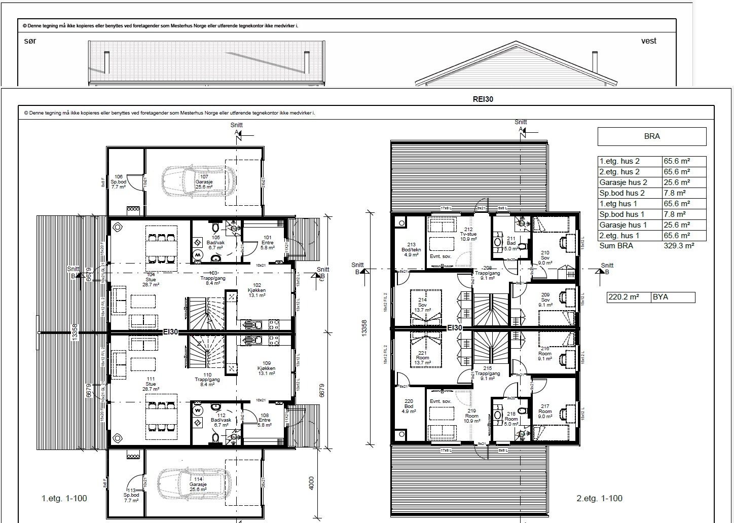 Hus nr. 7 - 14 kan leveres med Alt. 3 løsning med lukket garasje. Pristillegget for garasje er kr. 120.000,-. Det er et krav at begge tilknyttede enheter blir like, ergo vil den første som signerer kontrakt få avgjøre hvorvidt det blir carport eller garasje på valgte enhet.