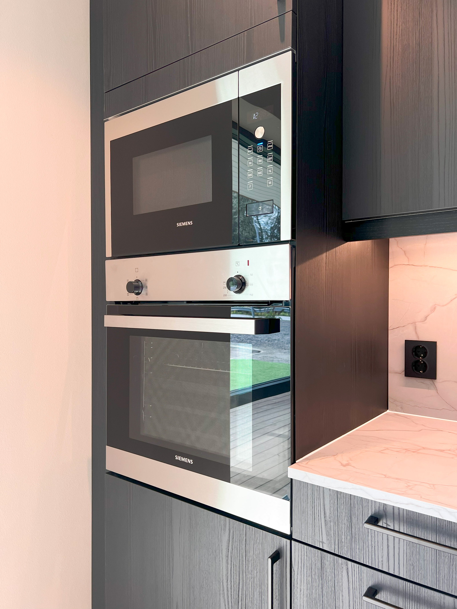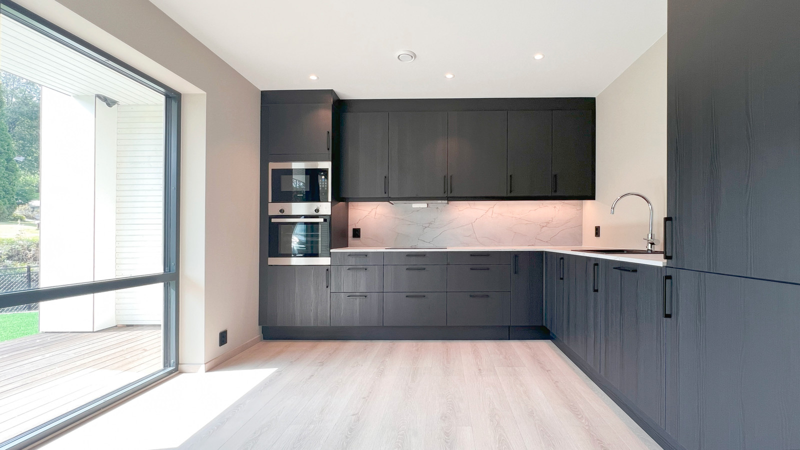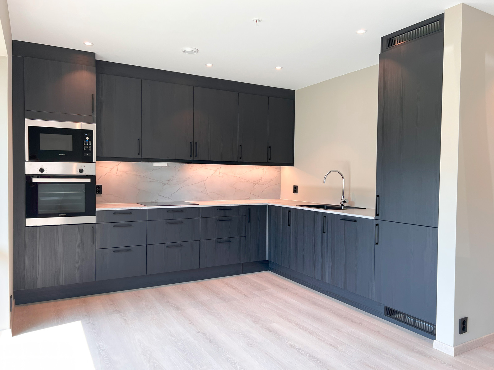 Vesentleg oppgradert kjøkken levert av HTH med Integrerte kvitevarer som oppvaskmaskin, induksjon platetopp, komfyr og kombinert kjøl-/fryseskåp.