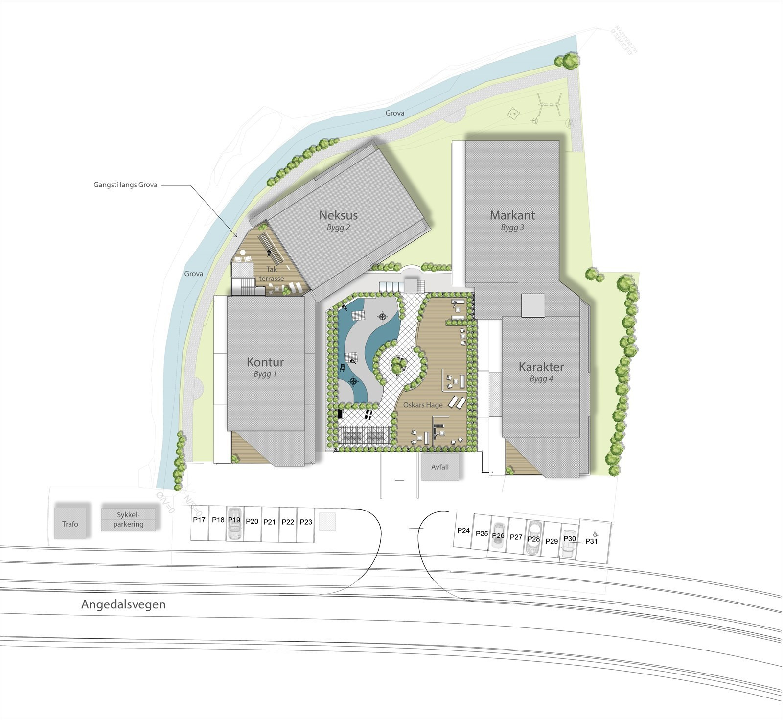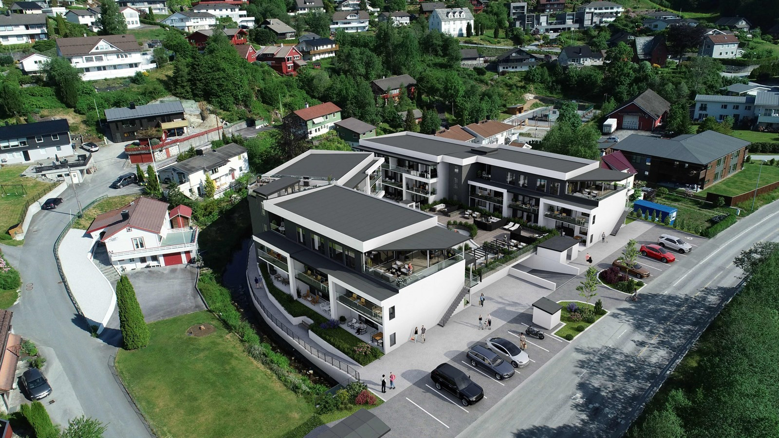 Alle parkeringsplasser vert tilrettelagt for ettermontering av ladesystem for El-bil, der ladar må kjøpast som tilval hjå elektrikar. Det vert levert med felles administrasjonsprogram for Easee Charge ladeanlegg.