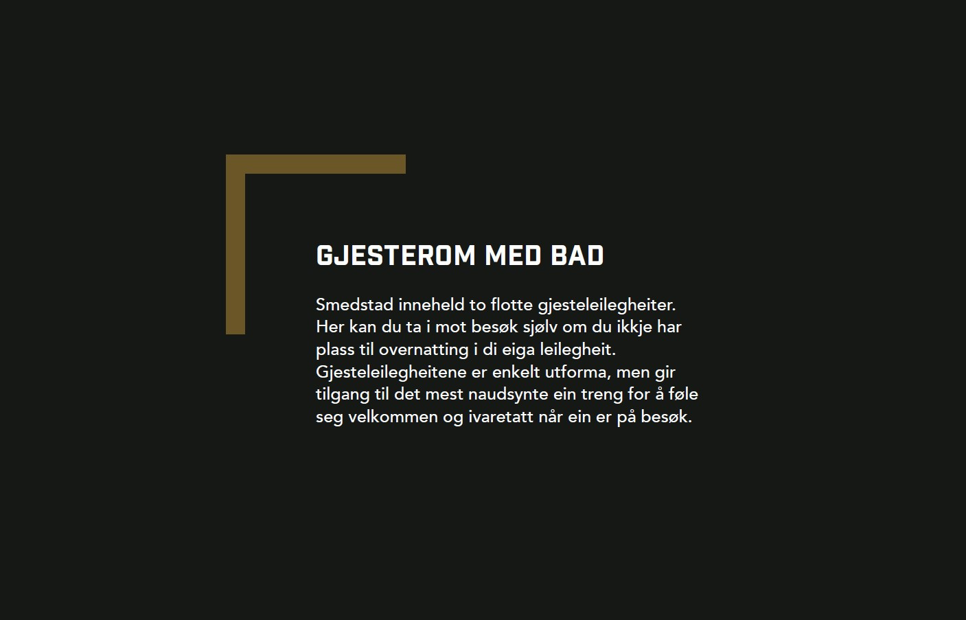 Venter du besøk av venner eller familie? På Smedstad får du tilgang til to gjesterom ein kan booke ved behov. Romma er fullt innreia med lite kjøkken, eige bad, senger, dyner, bord og stol. Gjesteromma har kjøleskåp og vann kokar om du ønsker morgon kaffi eller ein tekopp på sengekanten.