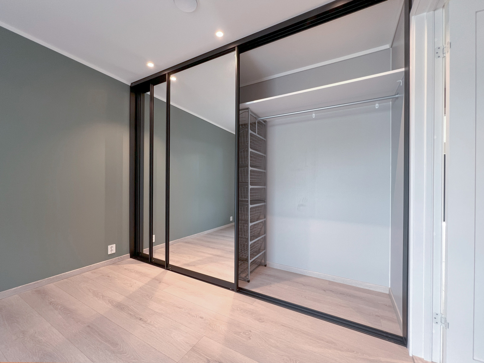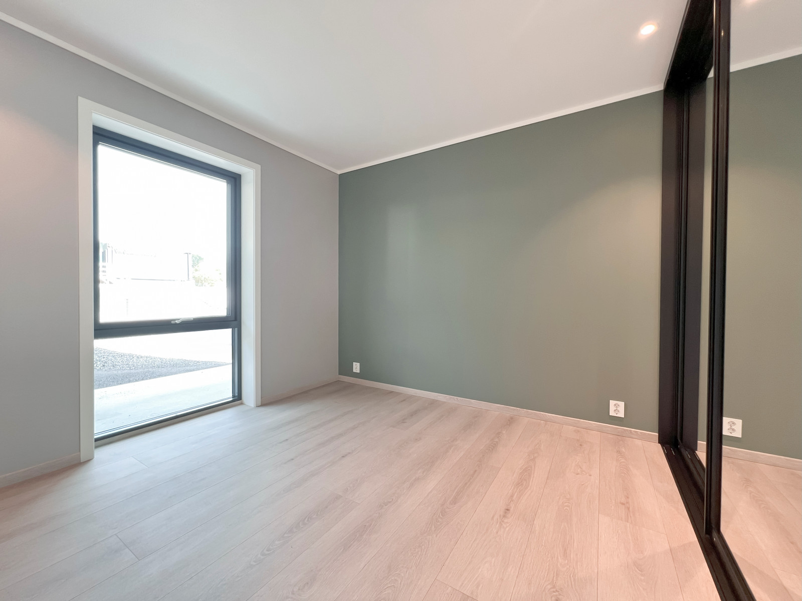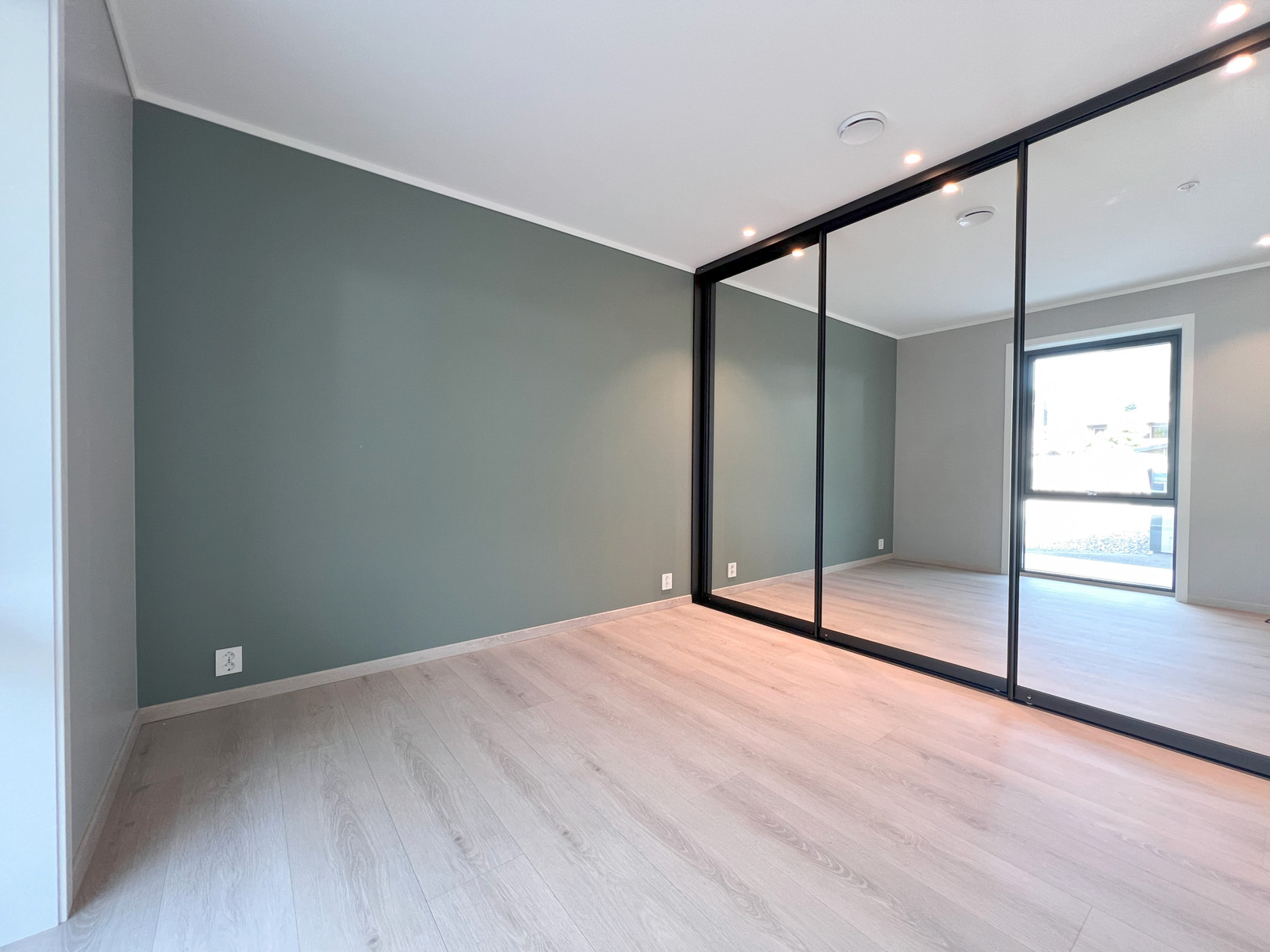 På hovudsoverommet er det ettermontert ein romsleg skyvedørsgarderobe med stilreine speildører med svart profil. Bak dørene skjuler det seg ein fullverdig og praktisk garderobeløysing med god oppbevaringsplass.