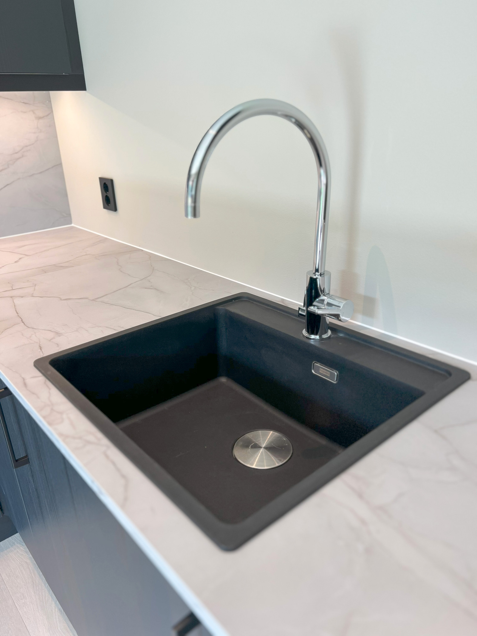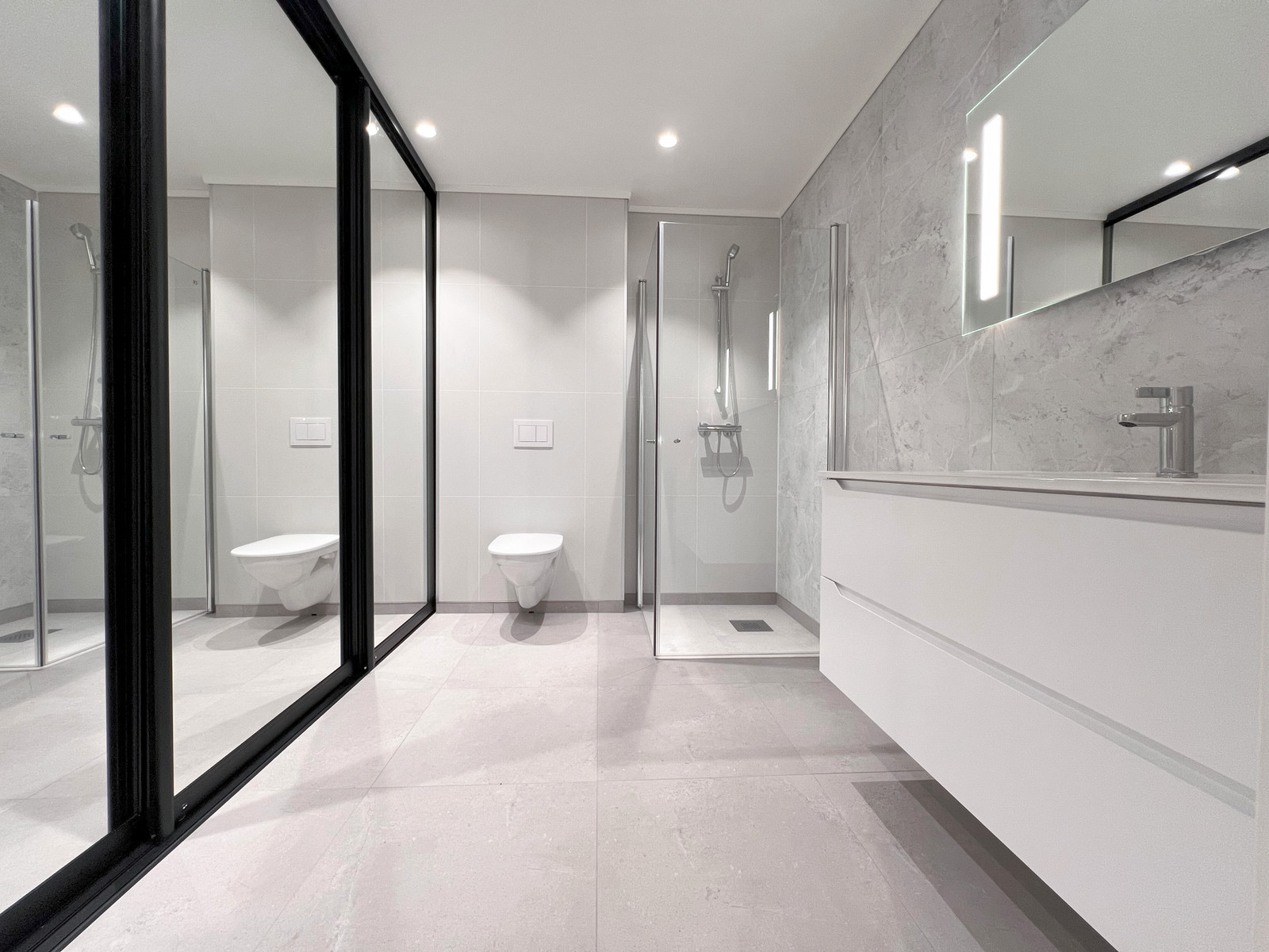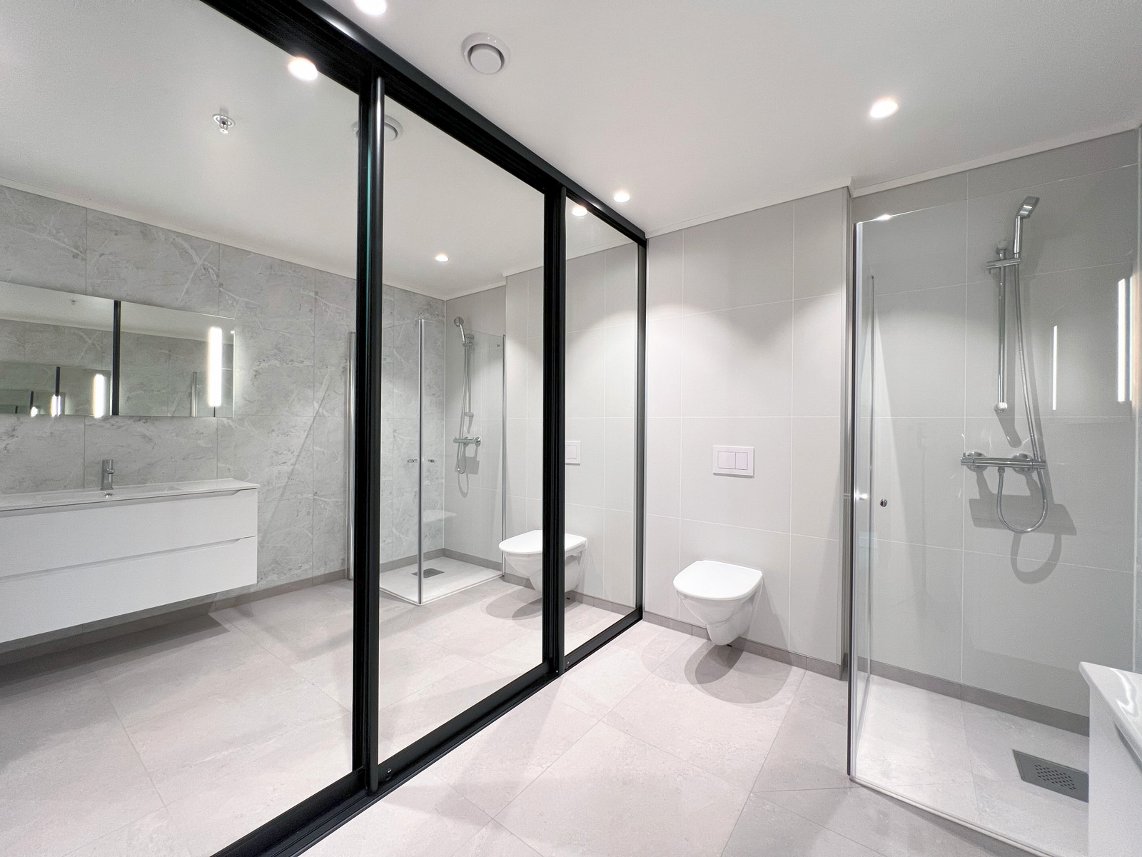 Det er også ettermontert speildører med svart profil på badet for å kunne skjule vaskemaskin, tørkestativ mm.