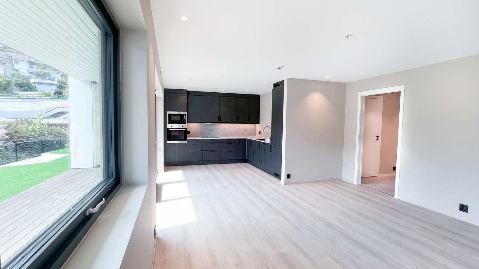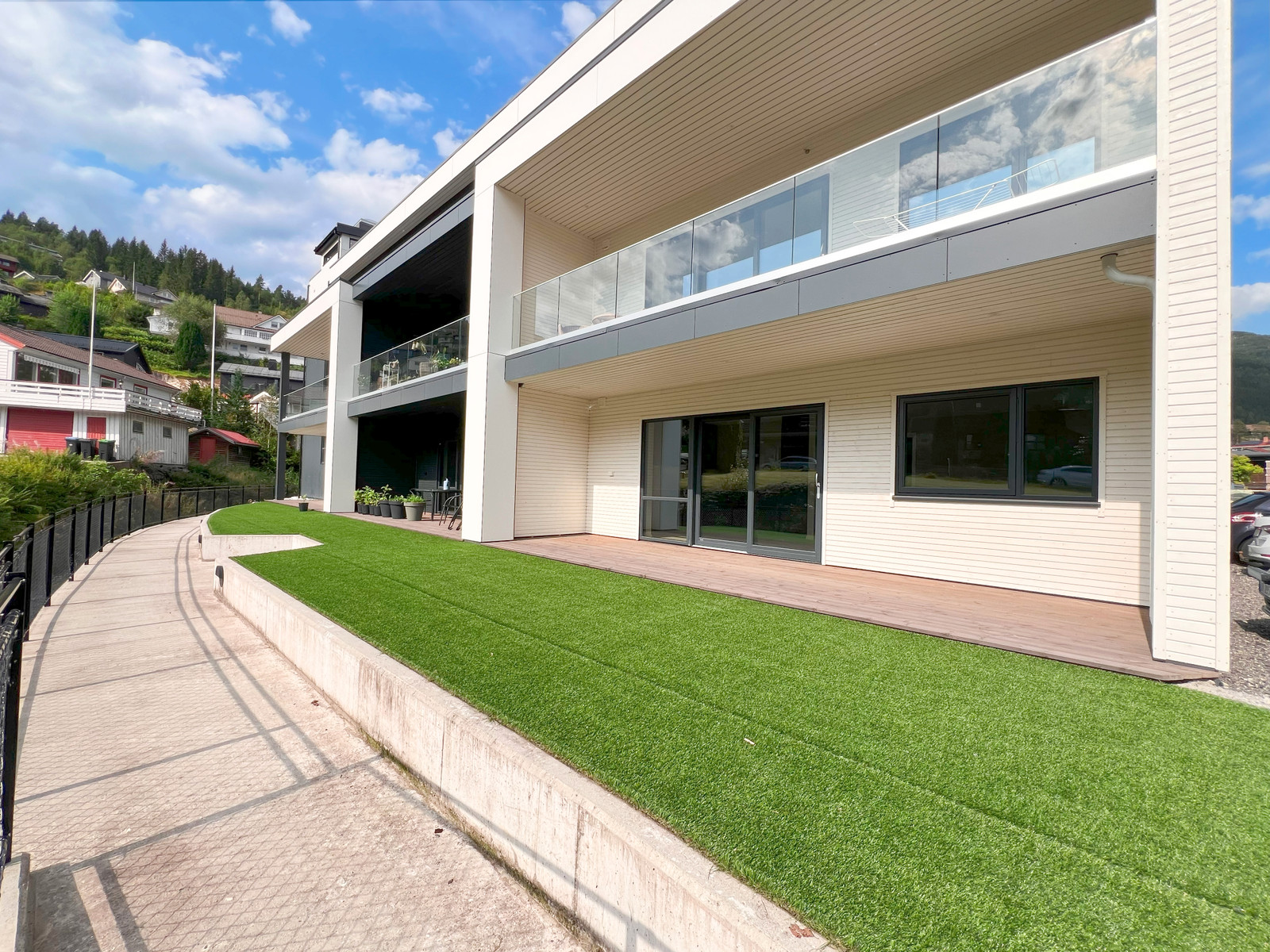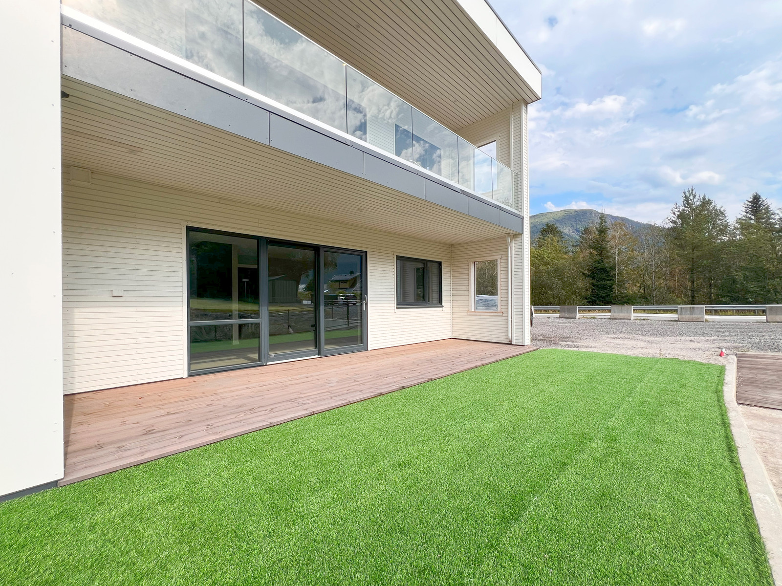 På terrassen er det montert terrassebord av typen Møre Royal, Consise grå.