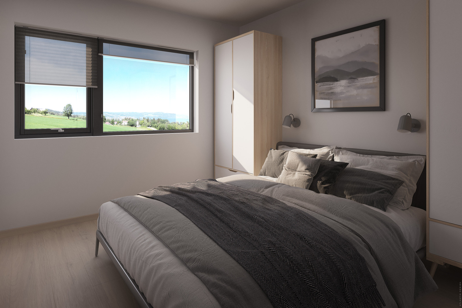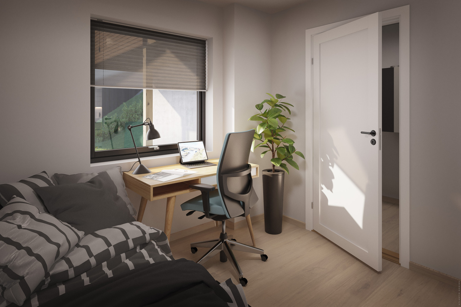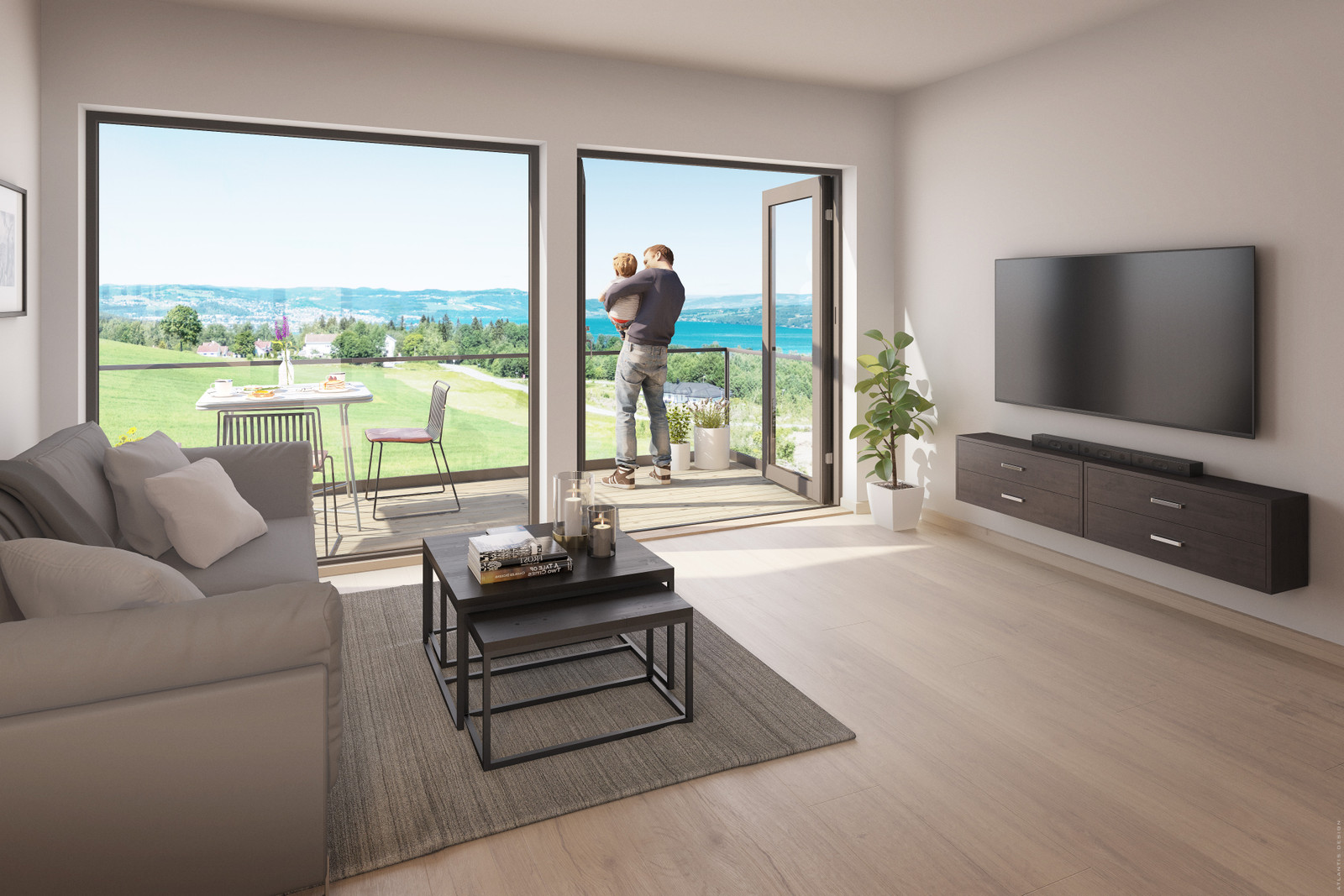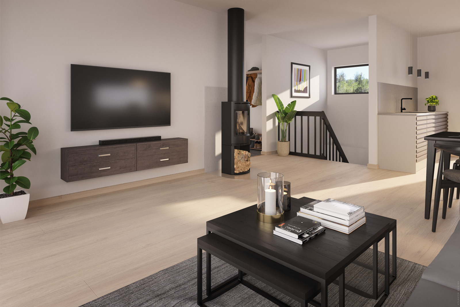 Boligene har 2 plan, med alt du trenger på hovedplanet; Carport, bod. entre, bad/vaskerom, soverom og en åpen stue-/kjøkkenløsning med utgang til terrasse i front og balkongen retning Gjøvik.