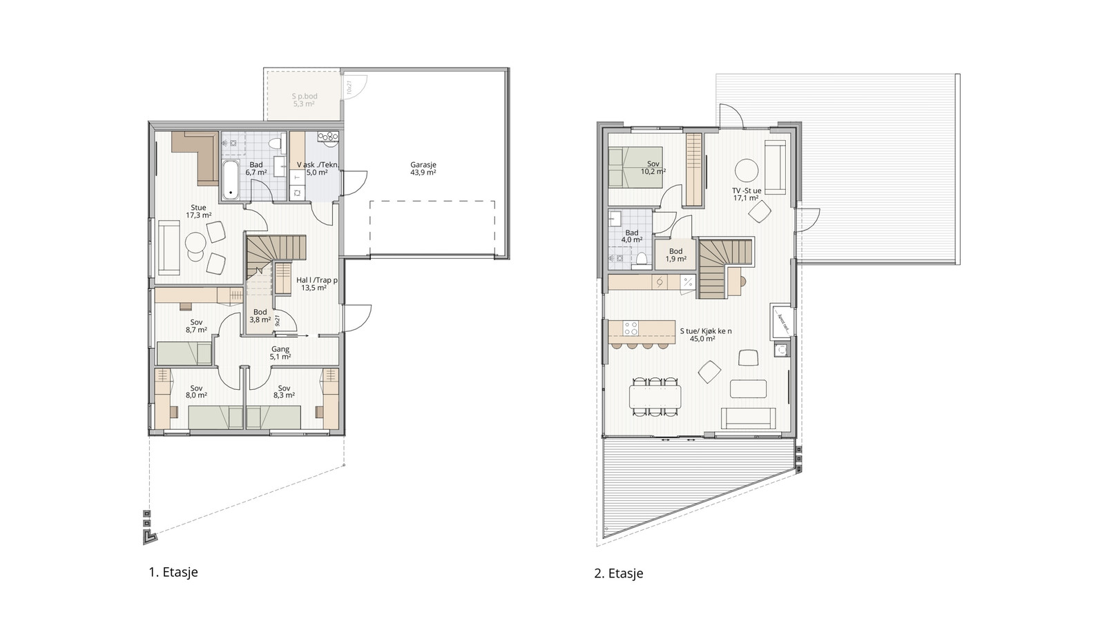 Første etasje: 3 skjermede soverom, bad, vaskerom/teknisk rom, samt en romslig hall som skaper et naturlig skille mellom sonene. Direkte adkomst til vaskerom via bi-inngang fra dobbel garasje med sportsbod.
