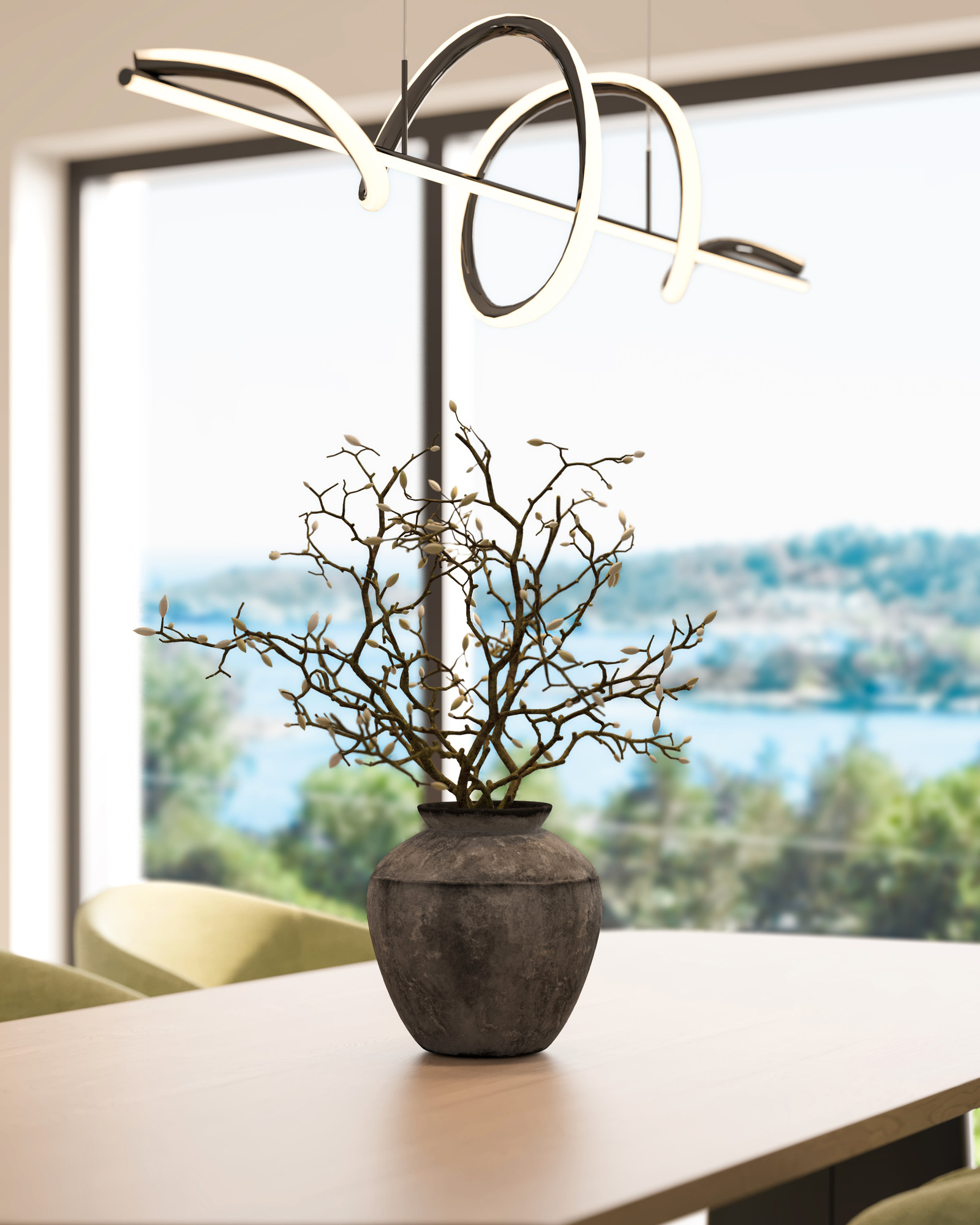 Den åpne stue- og kjøkkenløsningen i andre etasje skaper et luftig og innbydende allrom med rikelig lysinnslipp. Her får du store vindusflater som rammer inn utsikten og gir en følelse av å bo tett på naturen.