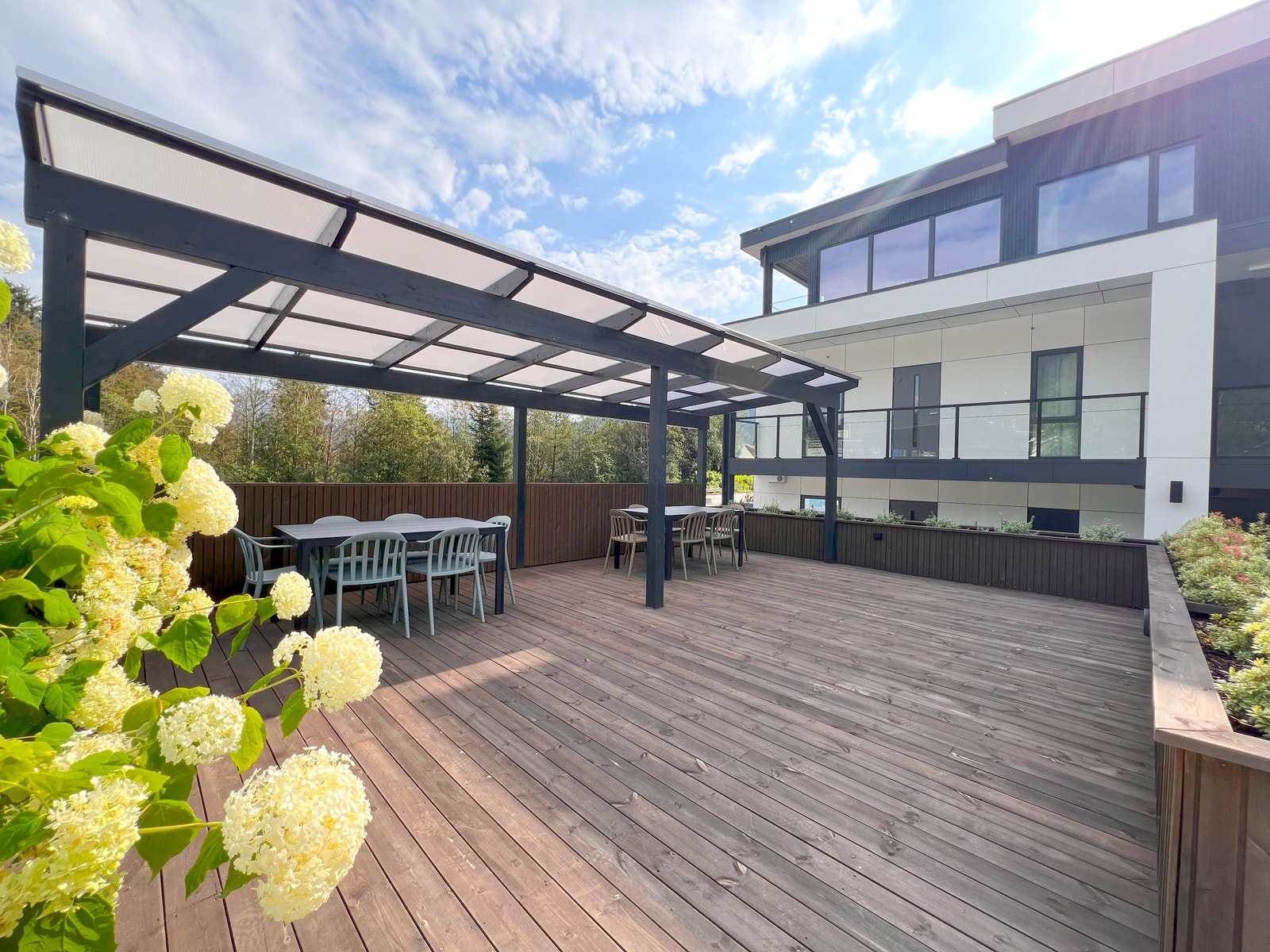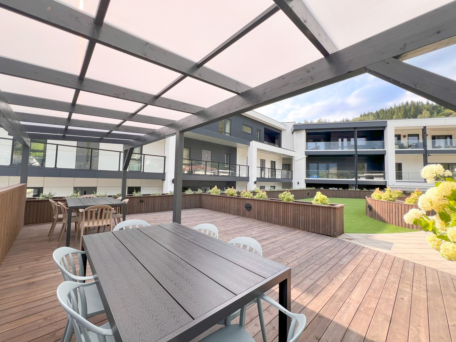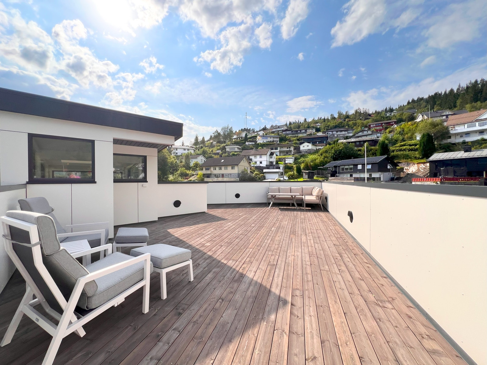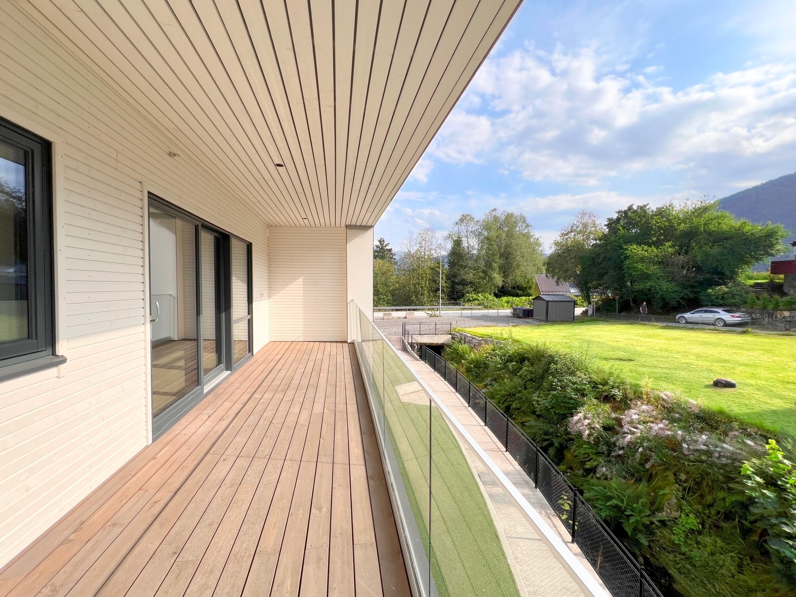 På terrassen er det montert terrassebord av typen Møre Royal, Consise grå. Glassrekkverk med skjulte stolpar for eit moderne og tidsriktig uttrykk.