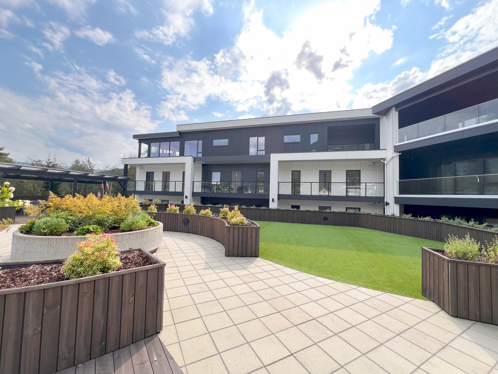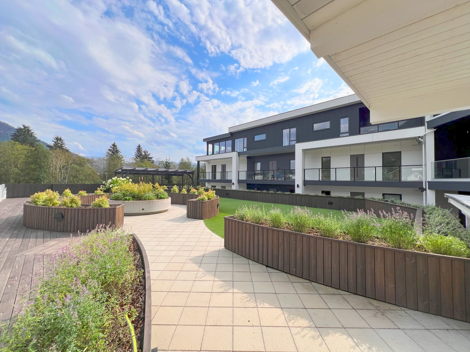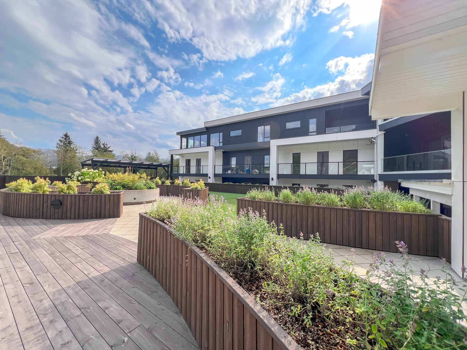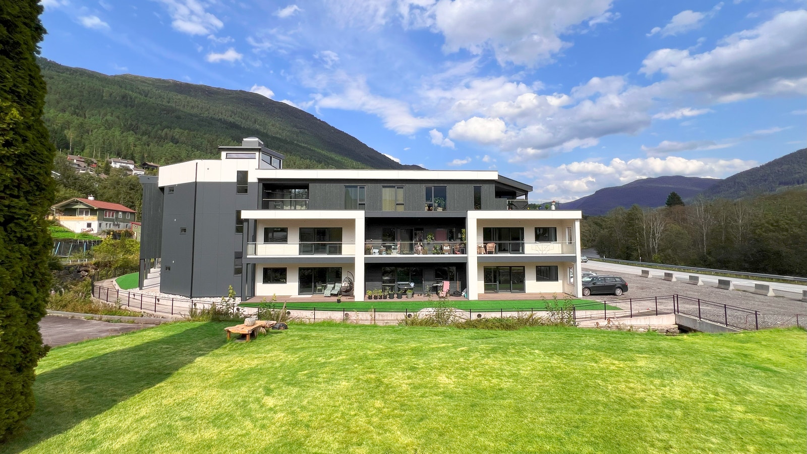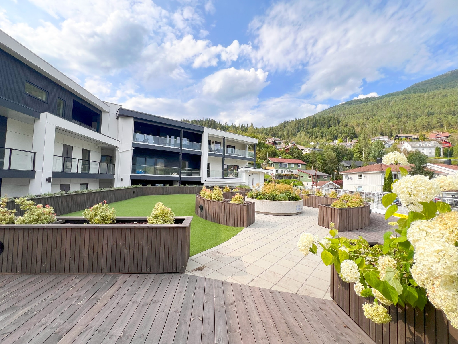 På terrassen er det montert terrassebord av typen Møre Royal, Consise grå. Glassrekkverk med skjulte stolpar for eit moderne og tidsriktig uttrykk.