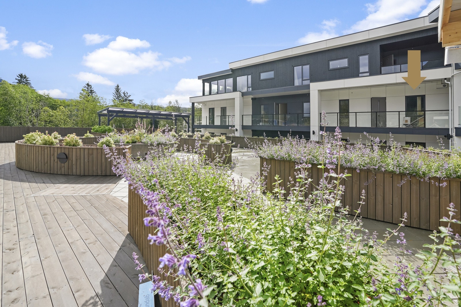Tomta ligg strategisk til og har sol omtrent heile året. Leilegheita har stor terrasse der ein kan nyte mykje ettermiddags- og kveldssol.