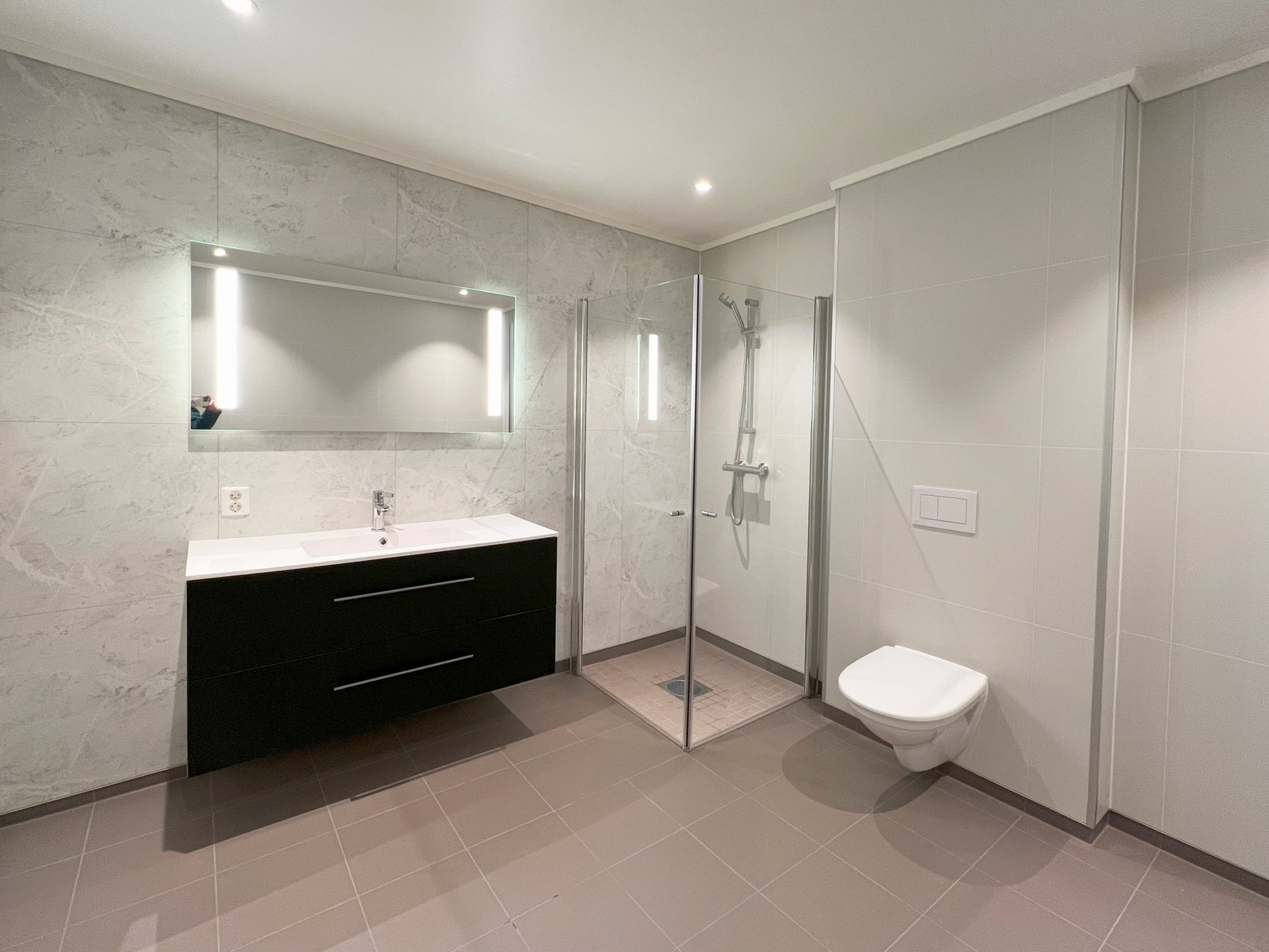 På bad vert det levert; Vegghengt toalett, 90 x 90 cm dusjveggar, dusjsett med dusjhovud og blandebatteri og opplegg for vaskemaskin.