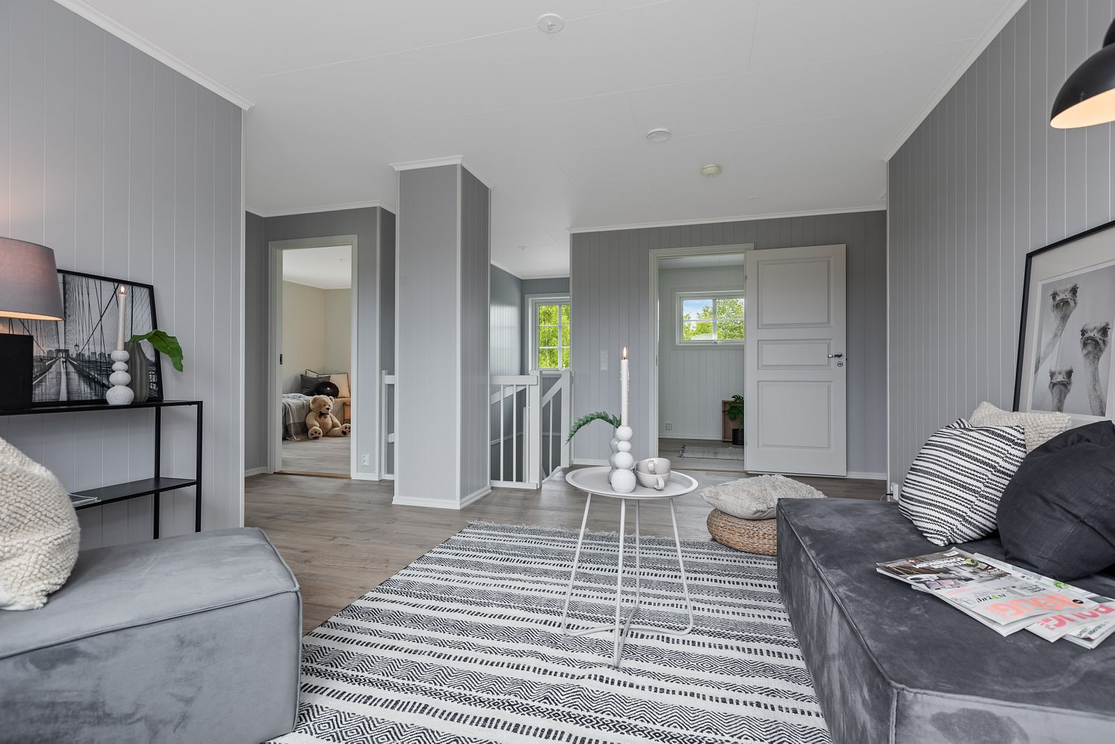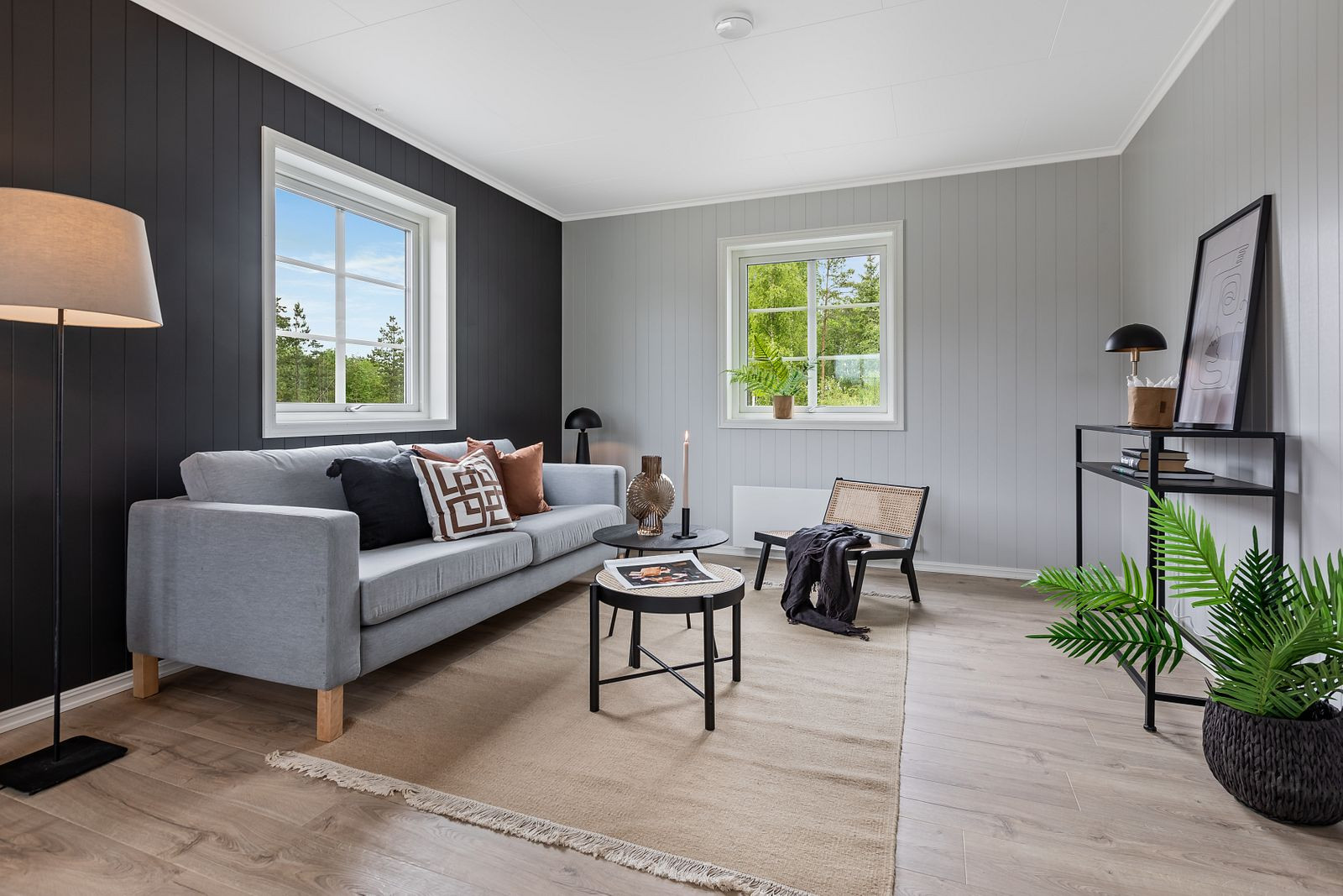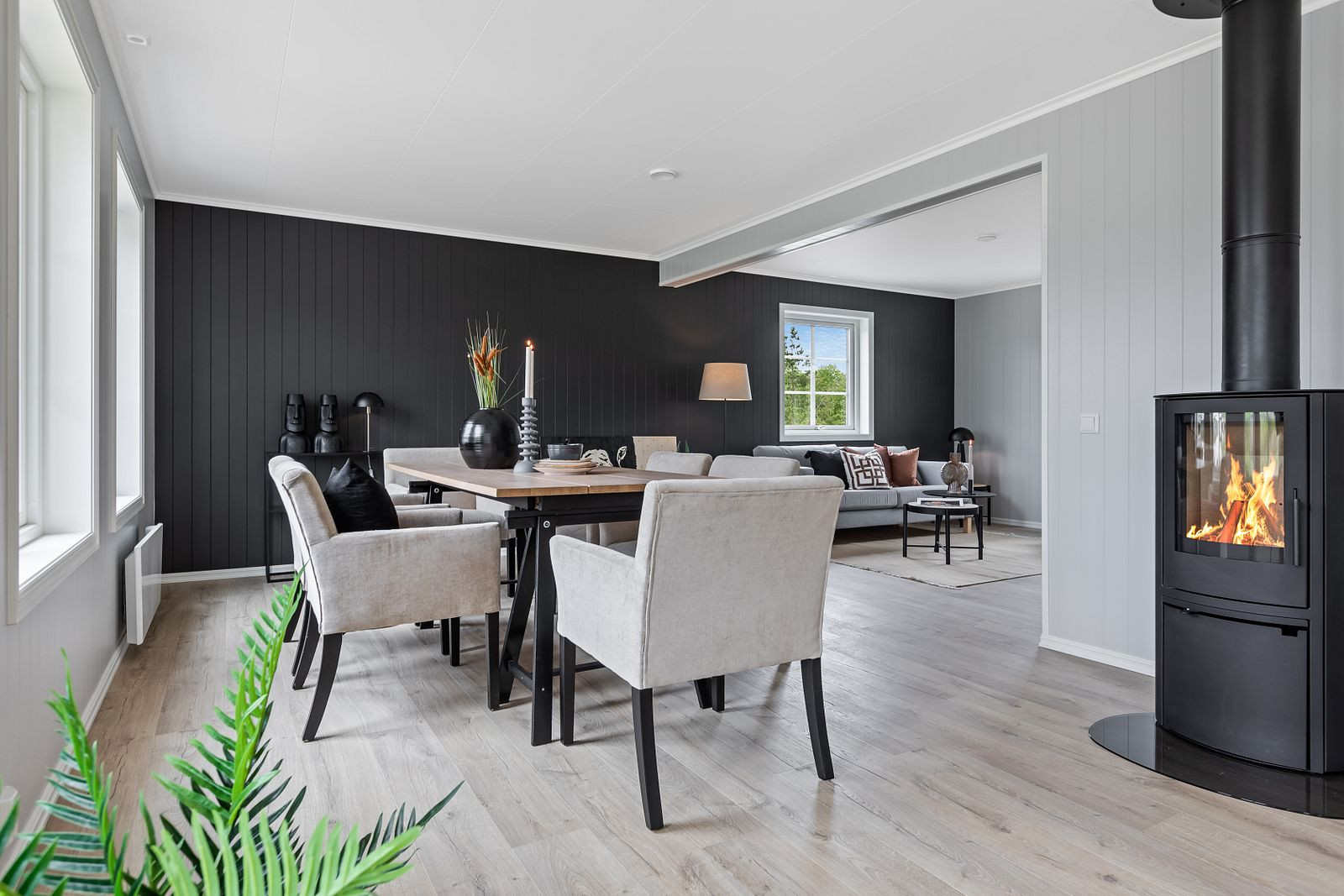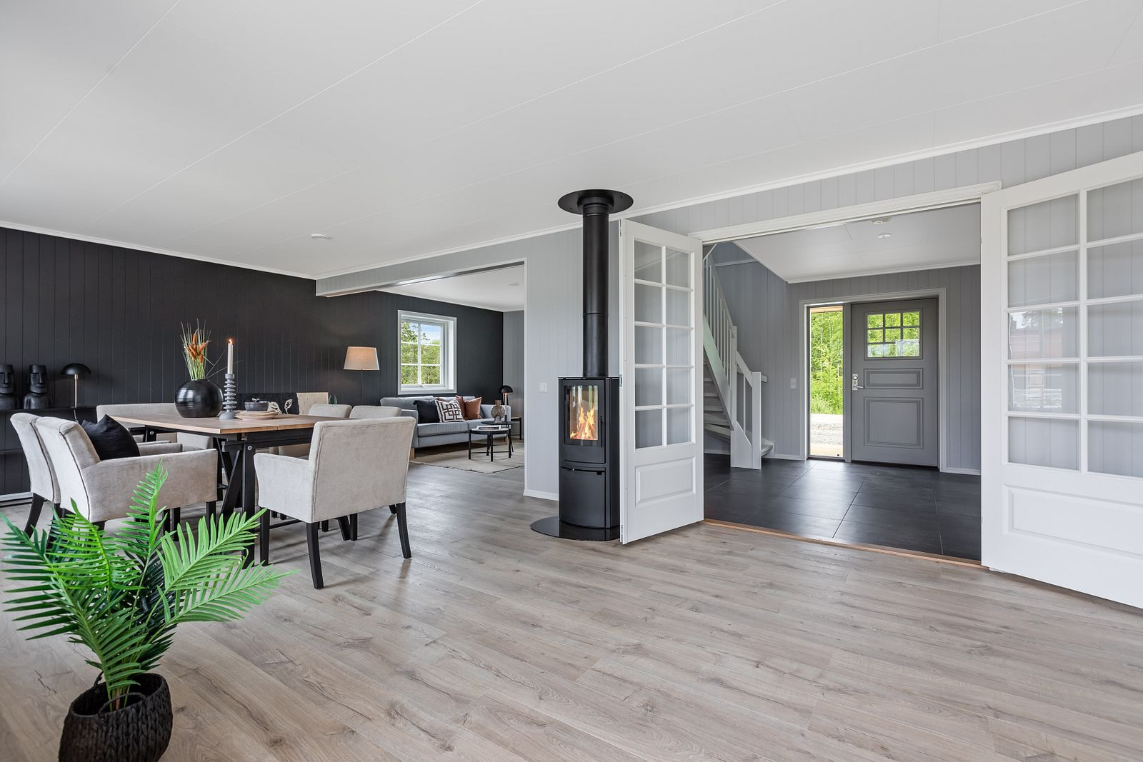 Meget lys og romslig vinkelstue med moderne peisovn type Visionline BLK 100 og utgang til stor, solrik hage. Åpen løsning med god plass til spisestue. Det er beregnet at man skal kunne etablere et femte soverom i del av stue ved behov.