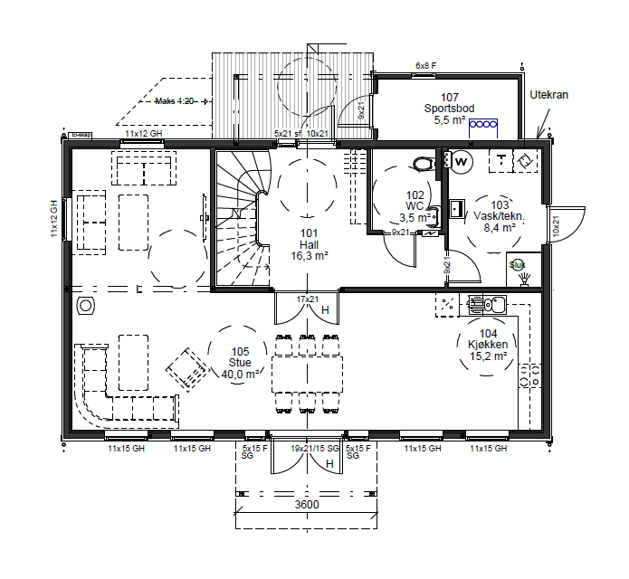 Pent, flislagt våtrom leveres med innsvingbare dusjdører 90x90, utslagsvask og dør ut til terreng. Tekniske installasjoner monteres her. Varmekabel i gulv.