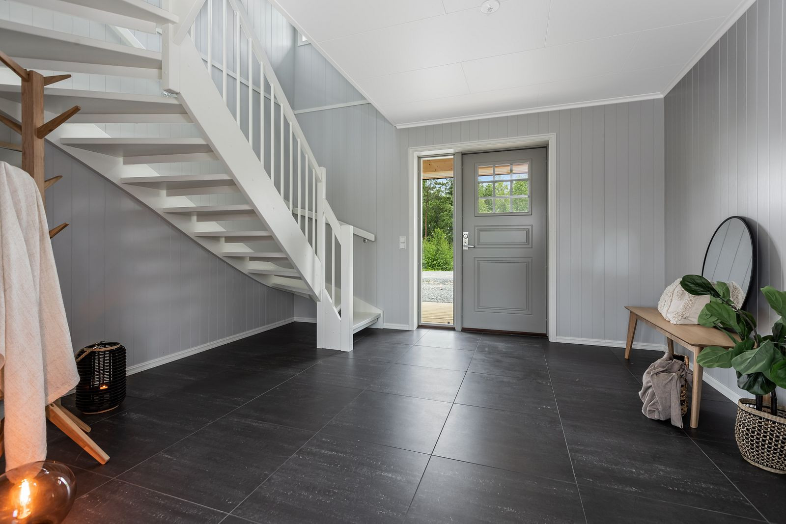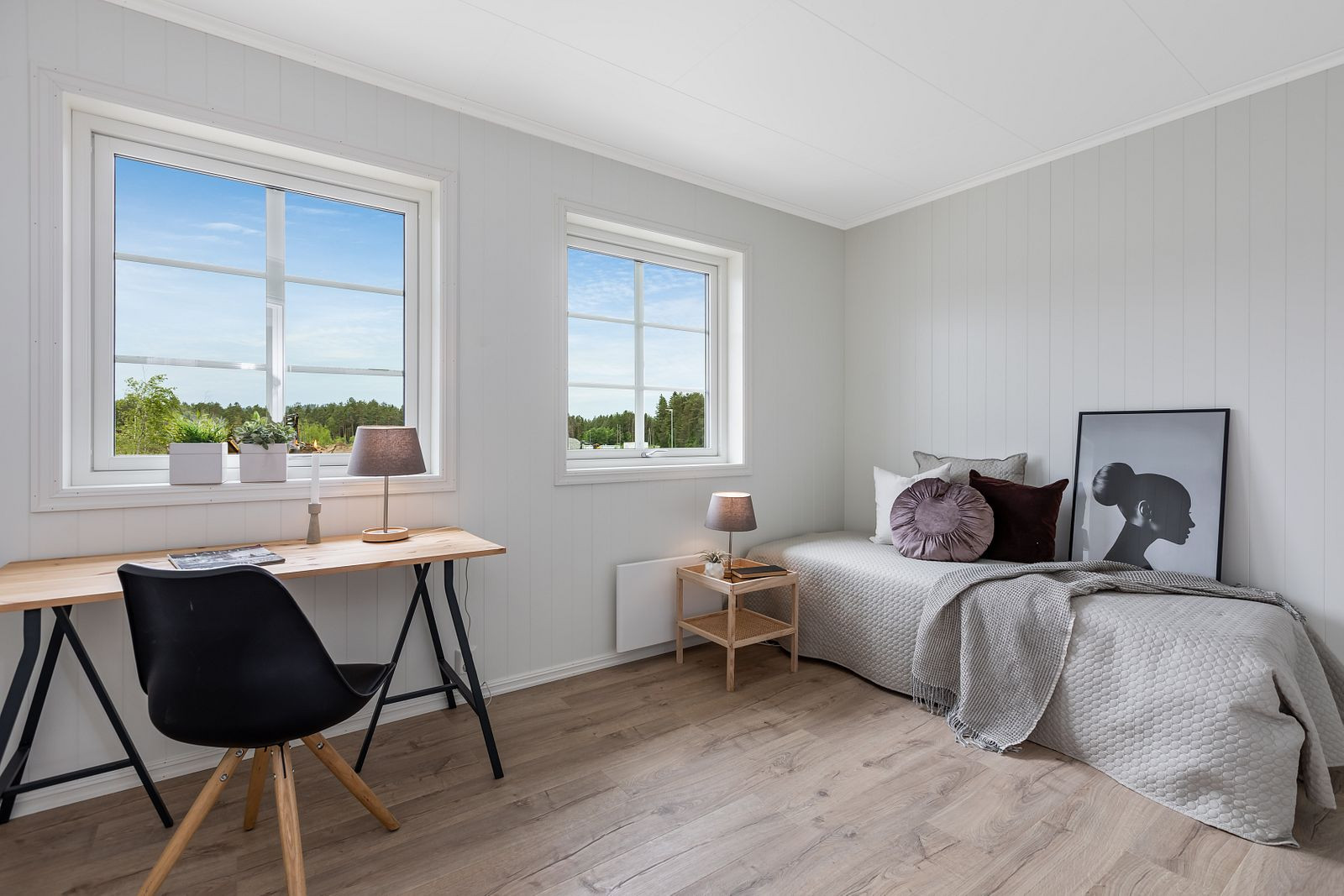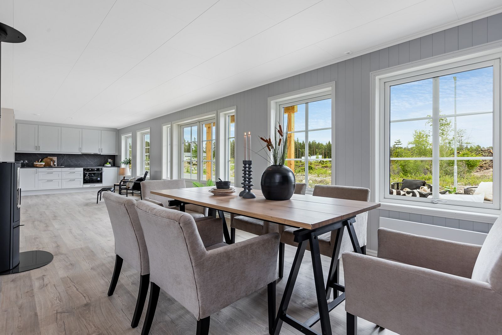 Boligen har store, fine rom og en meget god planløsning. Romslig hall med doble glassdører som fører inn til lys og trivelig vinkelstue. Stuen er utstyrt med moderne peis, har god plass til spisestue og via doble glassdører kommer man videre ut til solrik hage. Kjøkkenet har takhøy kjøkkeninnredning og integrerte hvitevarer. Det er totalt 4 soverom i boligen og man kan enkelt etablere et 5 soverom ved behov. Praktisk loftstue med utgang til balkong. Videre er det separat toalettrom og to bad/vaskerom. Godt med bodplass i utvendig sportsbod. TEK 17 standard og balansert ventilasjon. Spar strøm og uforutsette kostnader med et nytt energieffektivt hus som ikke trenger vedlikehold på mange år!
