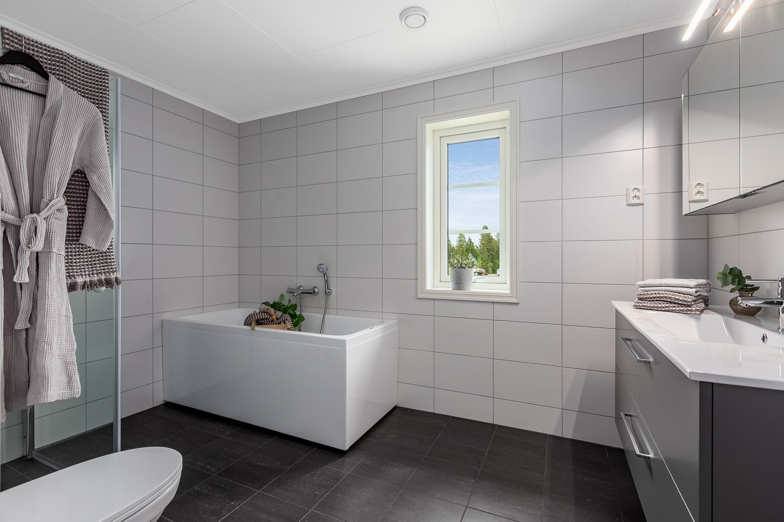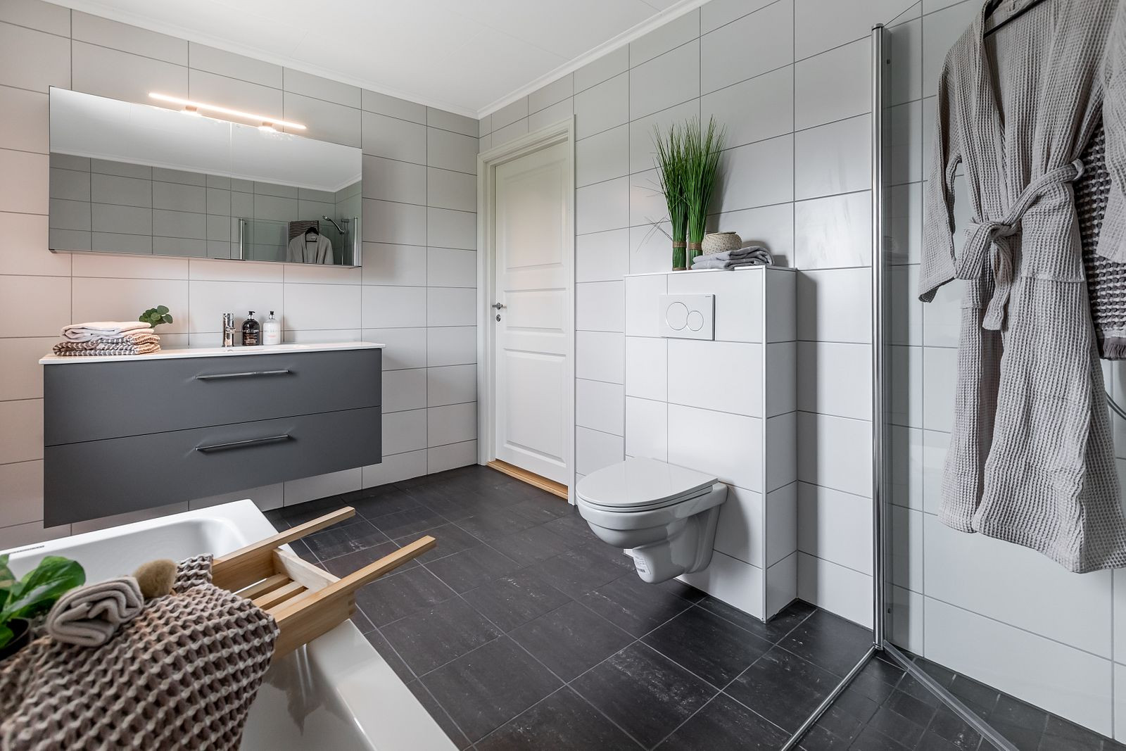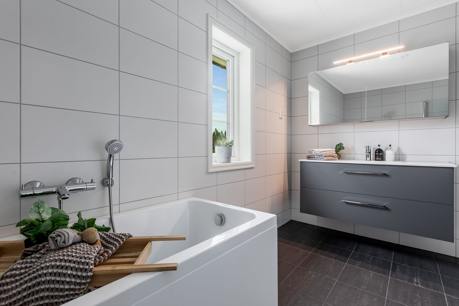 Pent, flislagt bad utstyrt med både dusj og badekar. Vegghengt toalett og Dansani 120 cm baderomsinnredning med to skuffer og speilskap med lys fra Bademiljø. Varmekabel i gulv.