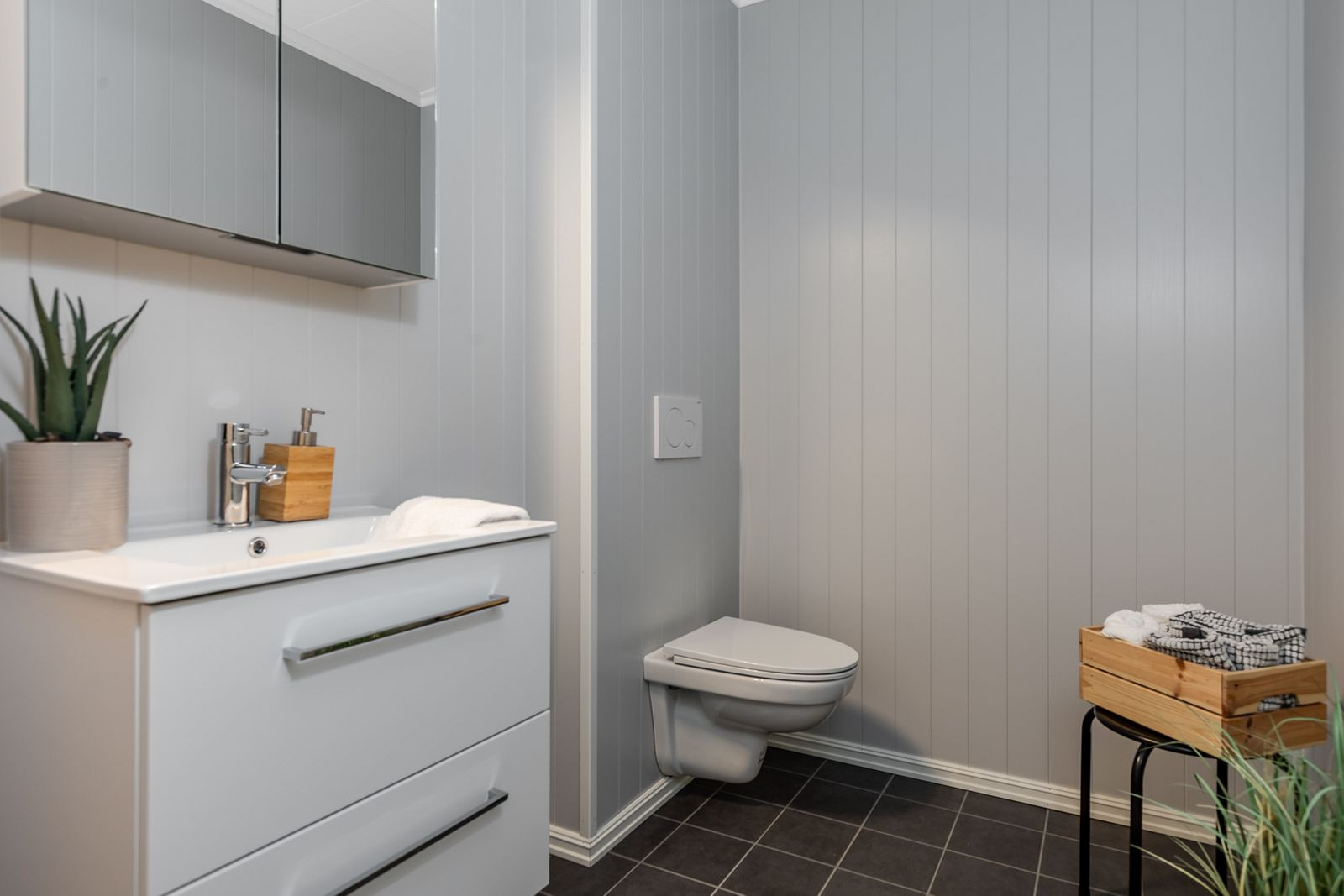 Fint gjestetoalett med vegghengt toalett, servant og speilskap med lys. Flislagt gulv med varmekabel.