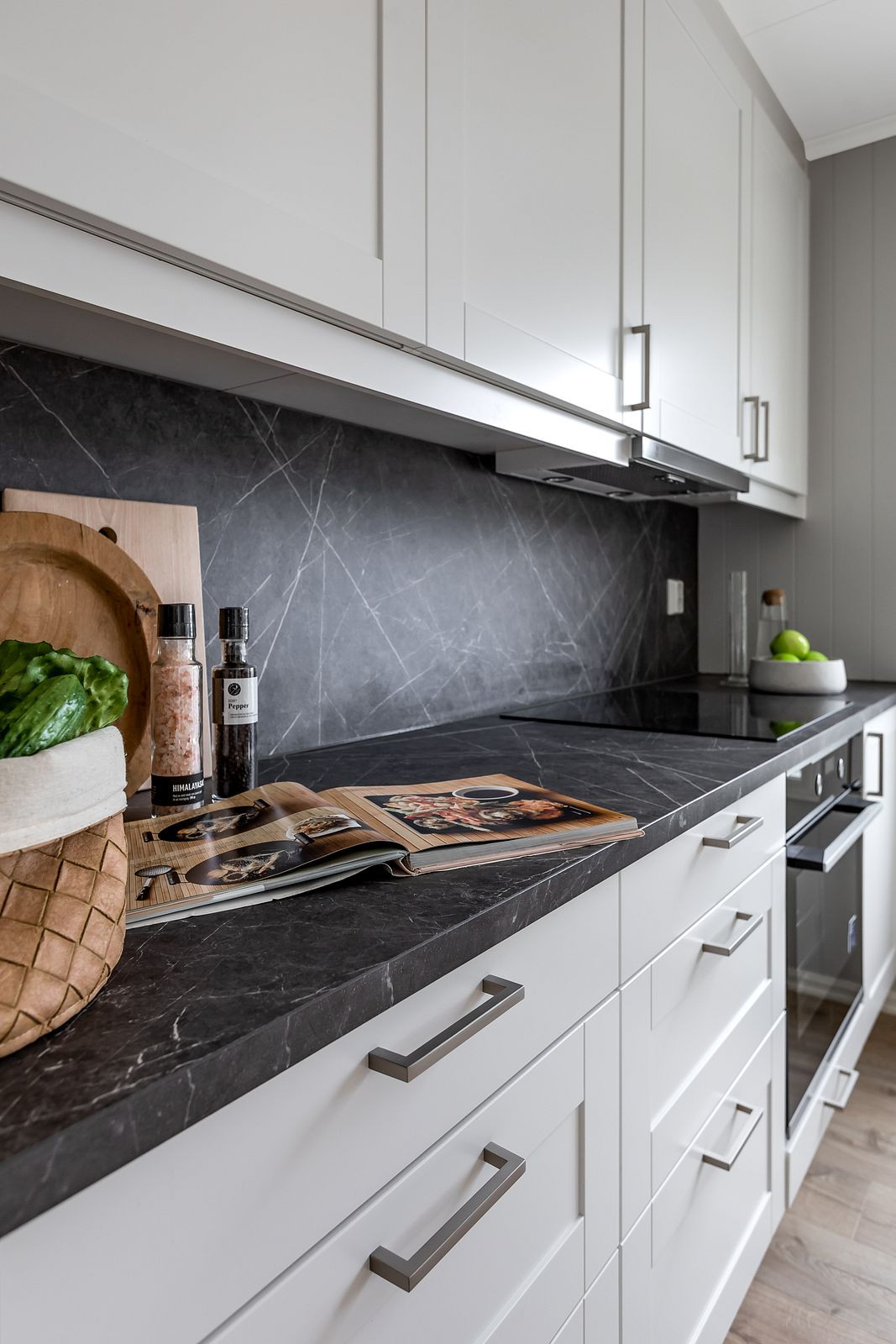 Takhøy, moderne kjøkkeninnredning fra Sigdal type Scala med hvite, profilerte fronter. Laminat benkeplate og kitchenboardplate type Grå Marmor. Hvitevarer bestående av integrert kombiskap, koketopp, stekeovn og oppvaskmaskin medfølger. Avtrekksvifte i kjøkkenskap er medregnet. Benkebeslag i rustfritt stål.