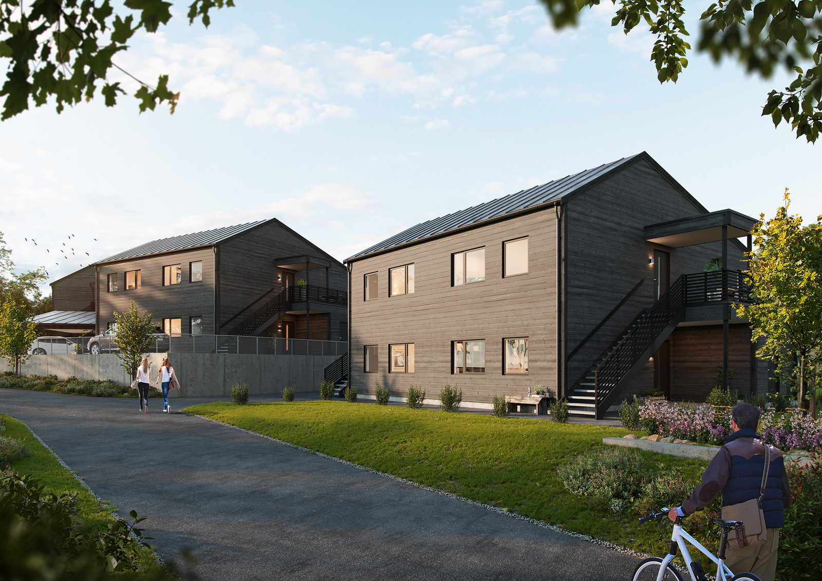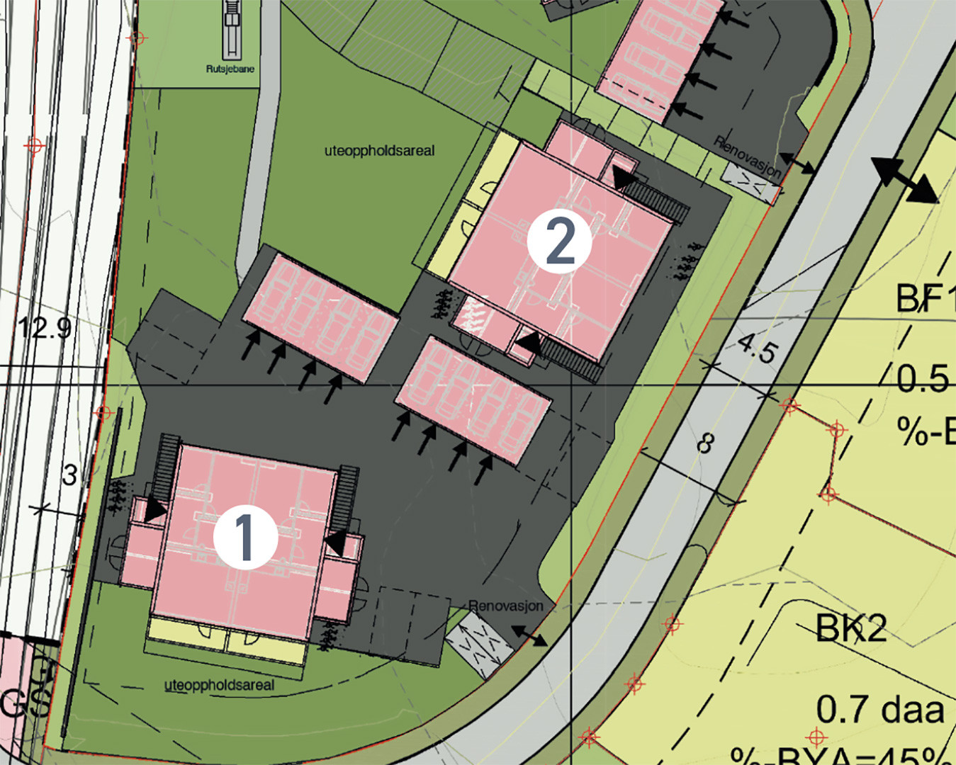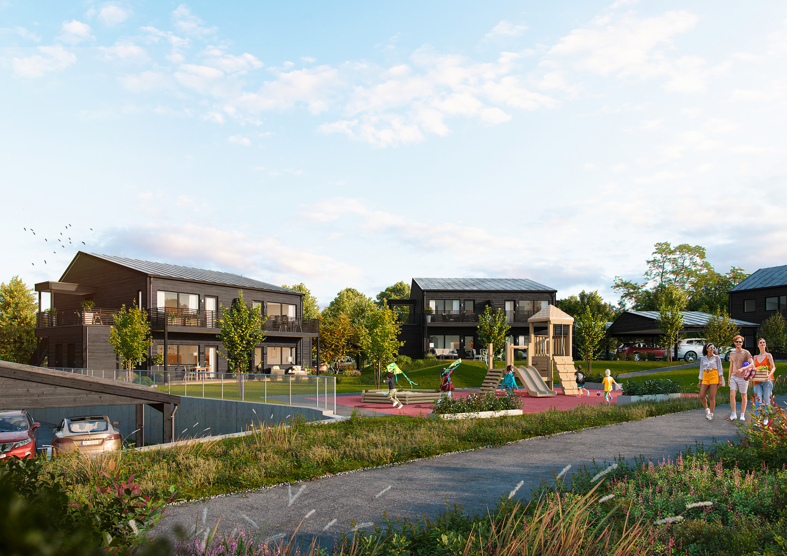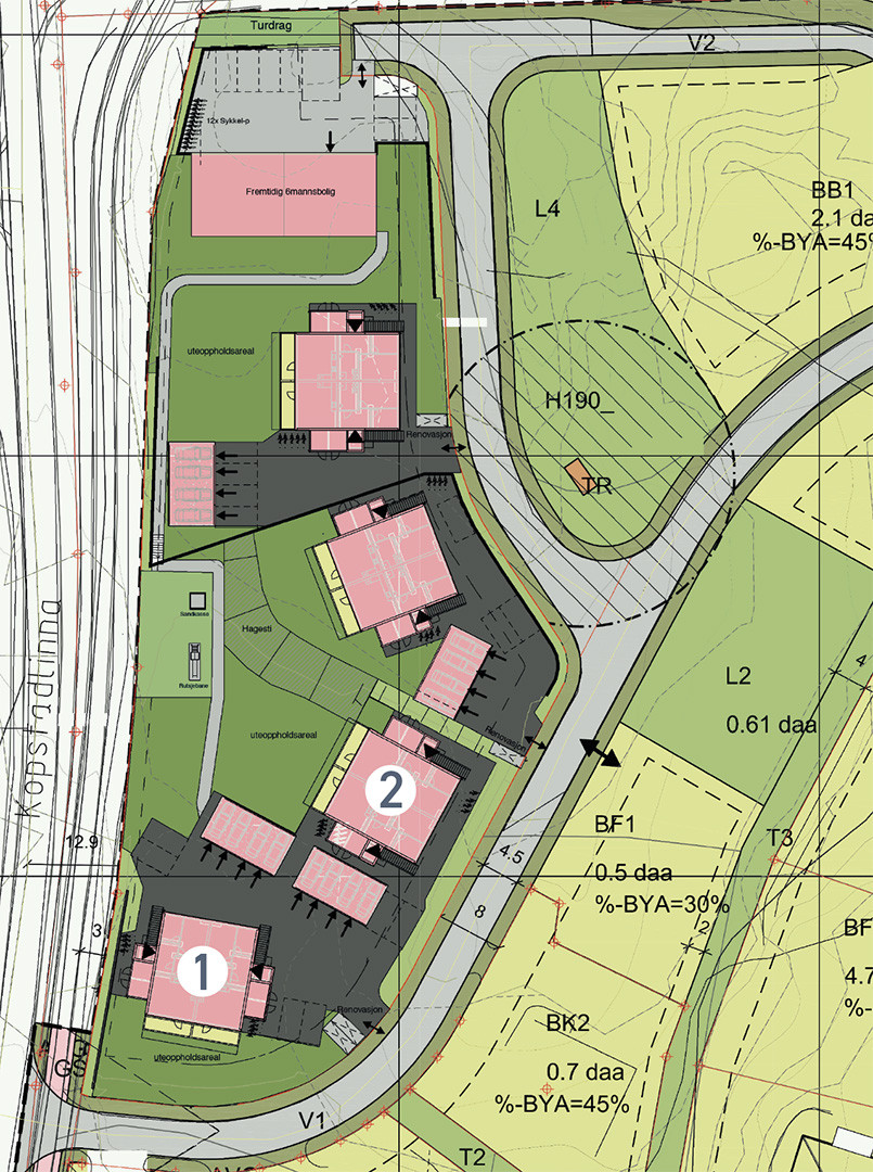 Bebyggelsen er vinklet slik at det skapes lune og solrike oppholdsarealer mellom byggene og koselig preg på området. Det skal opparbeides gangveier mellom oppholdsarealene og lekearealer, slik at man kan følge disse til fots. Her kan barna leke i trygge omgivelser med lite trafikk.