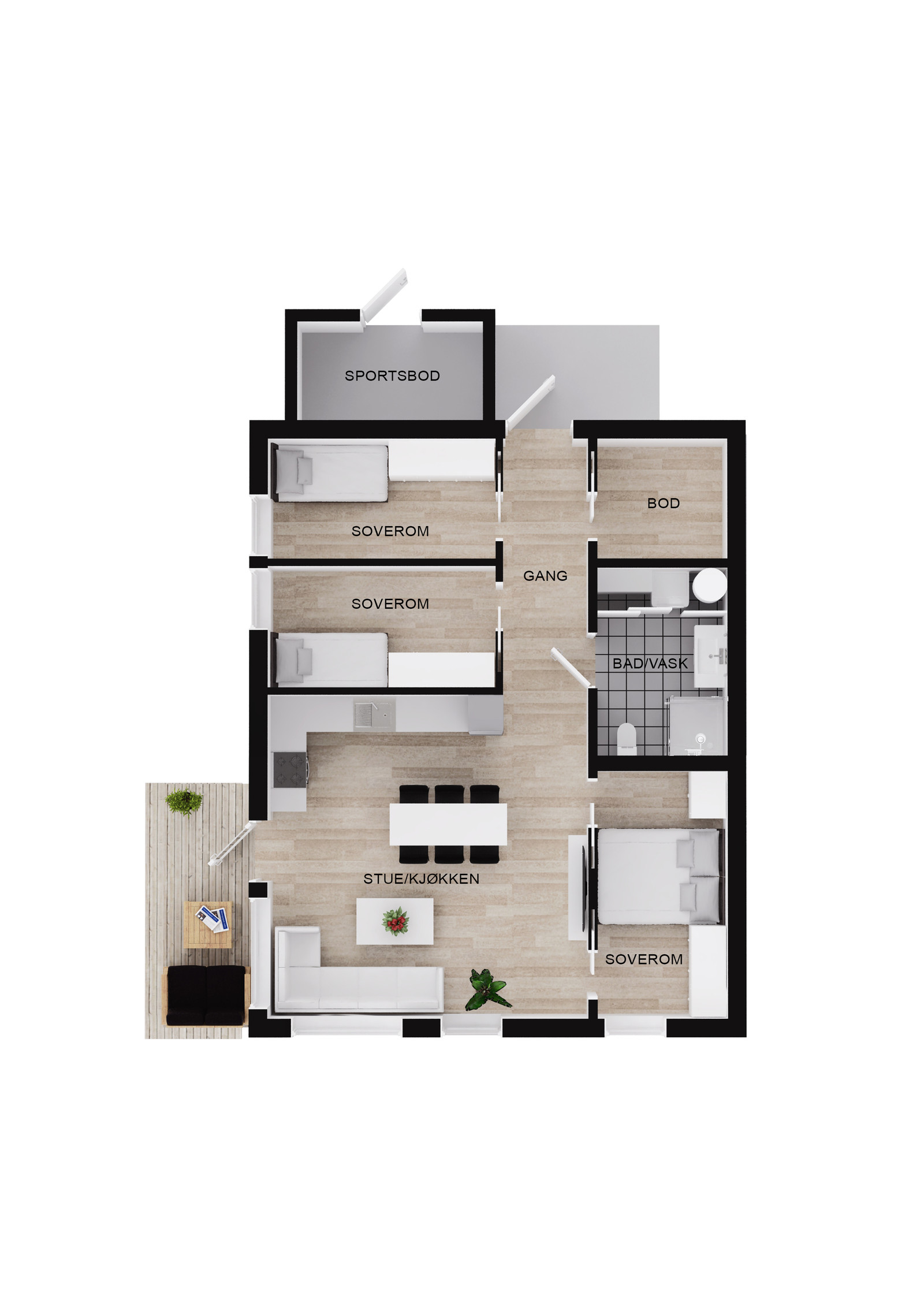 KVANT 3.0 har tre soverom som begge er plassert i nærhet til bad og oppholdsrom. Hovedsoverommet har plass til dobbeltseng og garderobe, mens de andre rommene egner seg like godt som barnerom, kontor eller gjesterom – alt etter behov og livssituasjon.