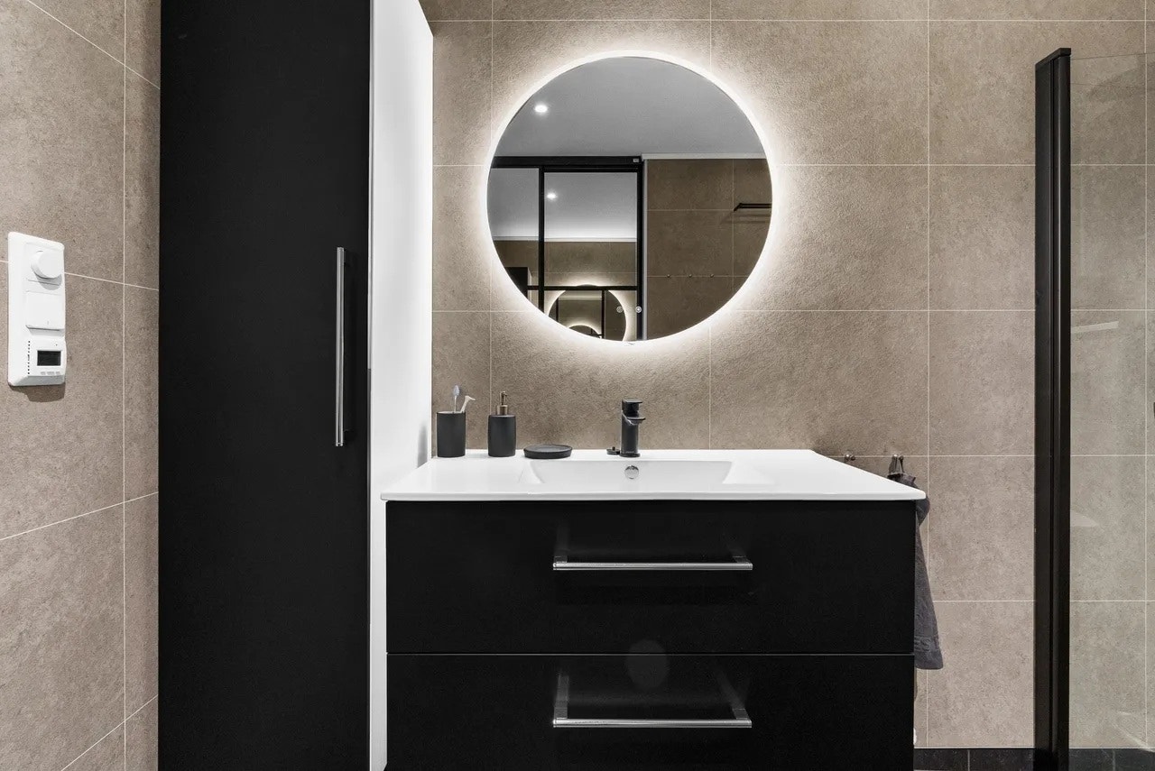 - Bad får keramiske flisar på golvet og baderomsplater på vegg. Her har vi av praktiske og estetiske årsaker laga moglegheit for å gøyme vekk vaskemaskina og varmtvasstanken bak skyvedører dersom det skulle være ønskeleg.