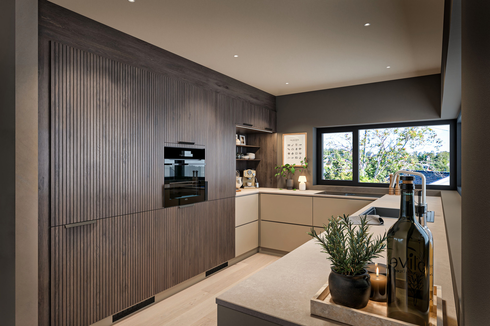Kjøkkenet vil få en klassisk u-form, optimalt for effektive arbeidssoner, romslighet og rikelig med lagringsplass. Utformingen og god benkeplass gjør det også enkelt for to eller flere personer å tilberede et måltid uten å forstyrre hverandre for mye.