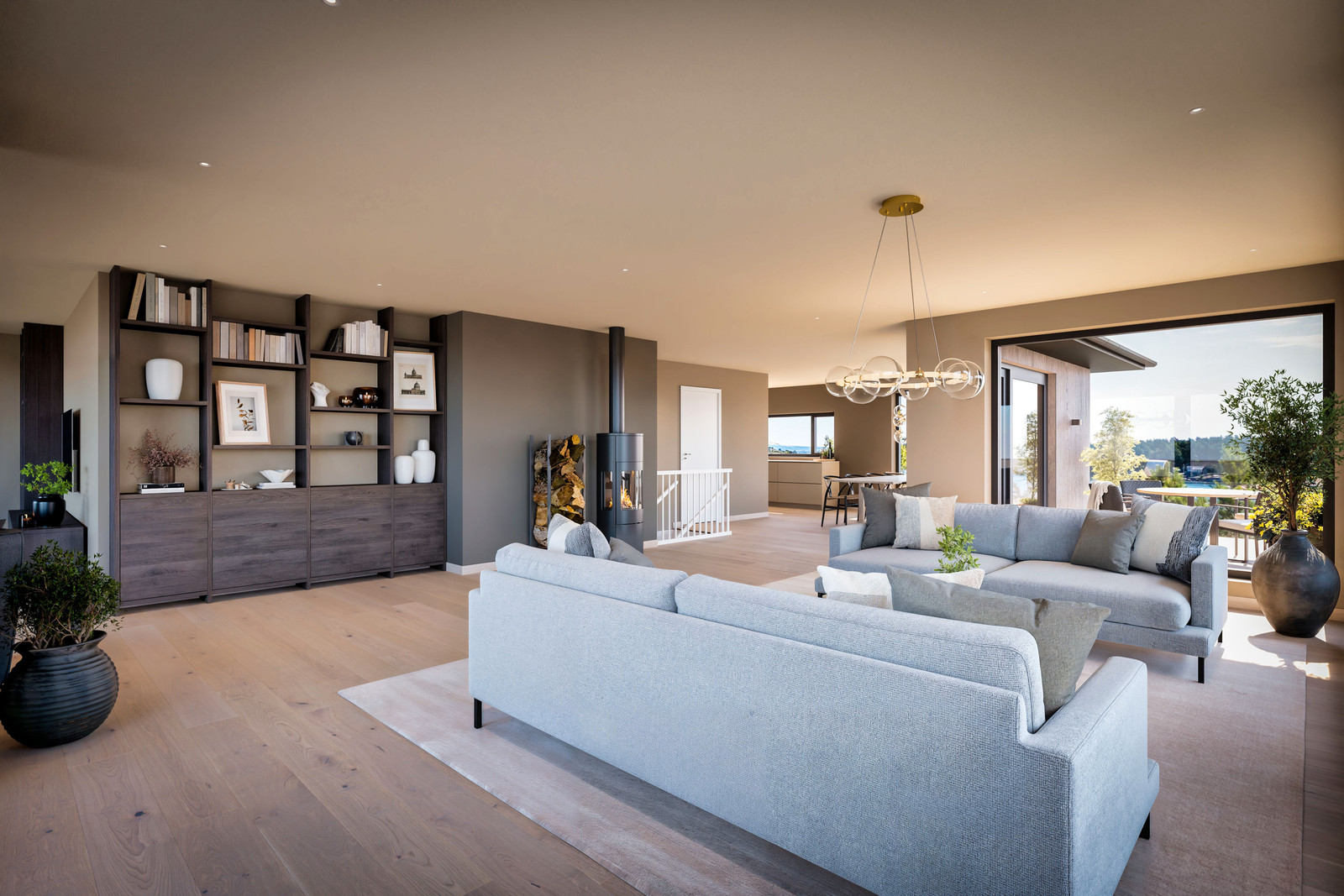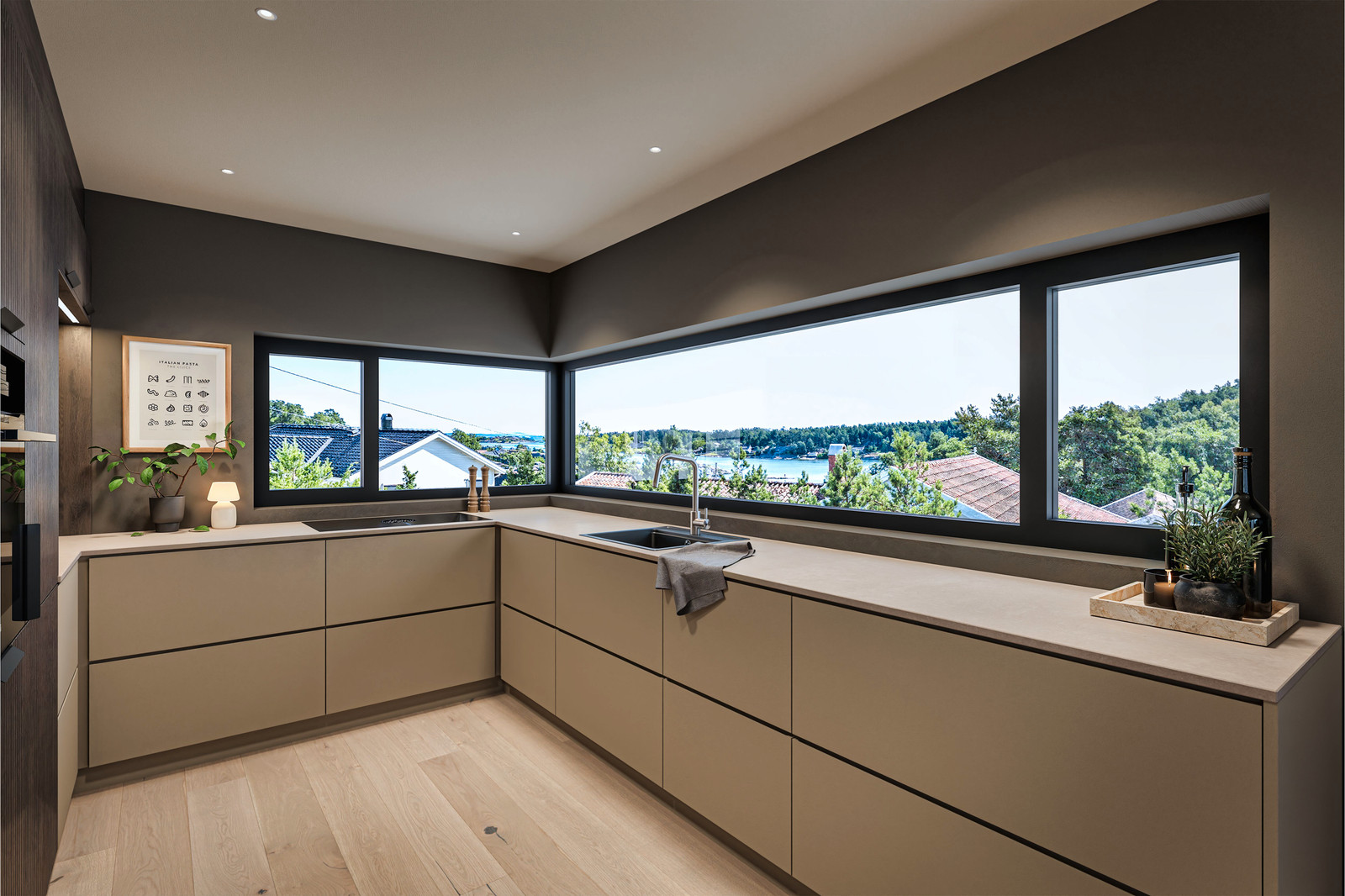 Her er lite overlatt til tilfeldighetene. Store vindusflater er noe som både gir boligene særpreg og fremhever den flotte utsikten. I tillegg gir det oppholdsrommene godt med naturlig lys. På kjøkkenet er dette en særlig god kvalitet! Det er tiltenkt et beløp stort kr. 300.000,- til kjøkken i prosjektet.