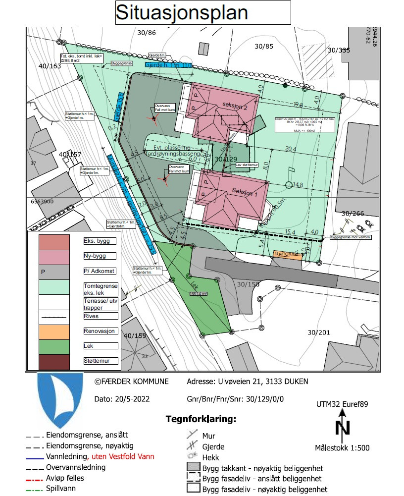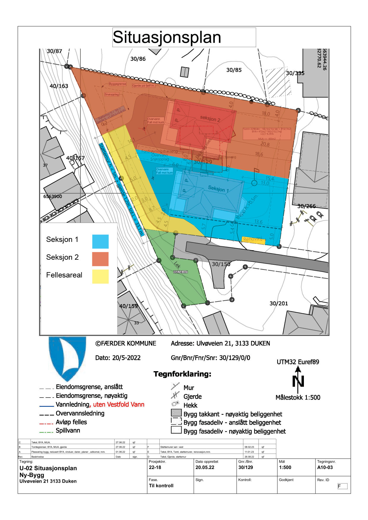 Tomten skal seksjoneres. Det blir plantet en bøkehekk mellom boligene som går fra øst til vest som et naturlig skille. Det blir felles adkomstvei. Disponeringen av tomten vi for øvrig være som vist på kartskisse.
