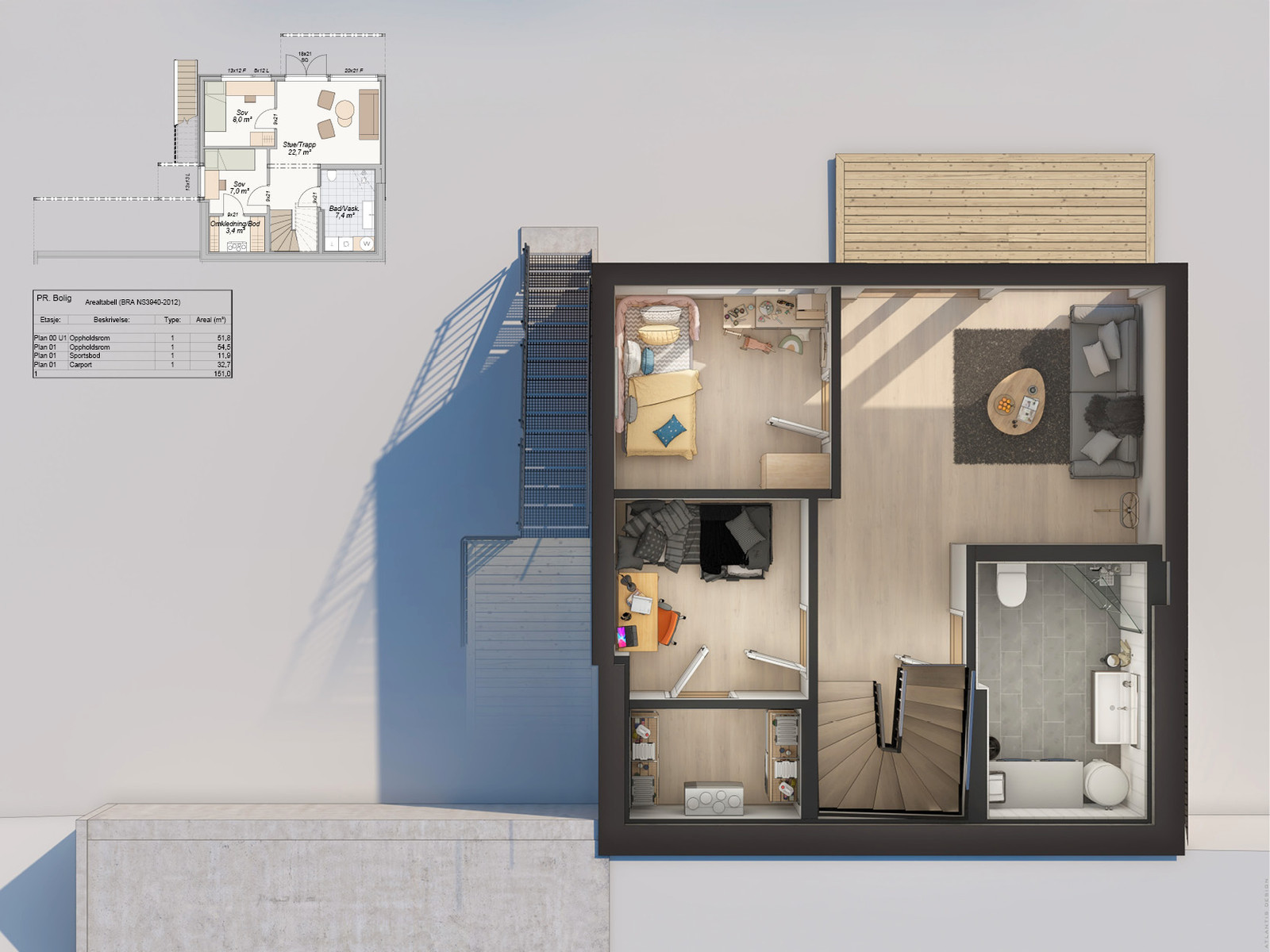 Boligene har 2 plan, med alle funksjoner på hovedplanet; Dobbel carport, stor sportsbod, entre, bad/vaskerom, soverom og en åpen stue-/kjøkkenløsning med utgang til terrasse i front og til balkongen med Mjøsutsikt.