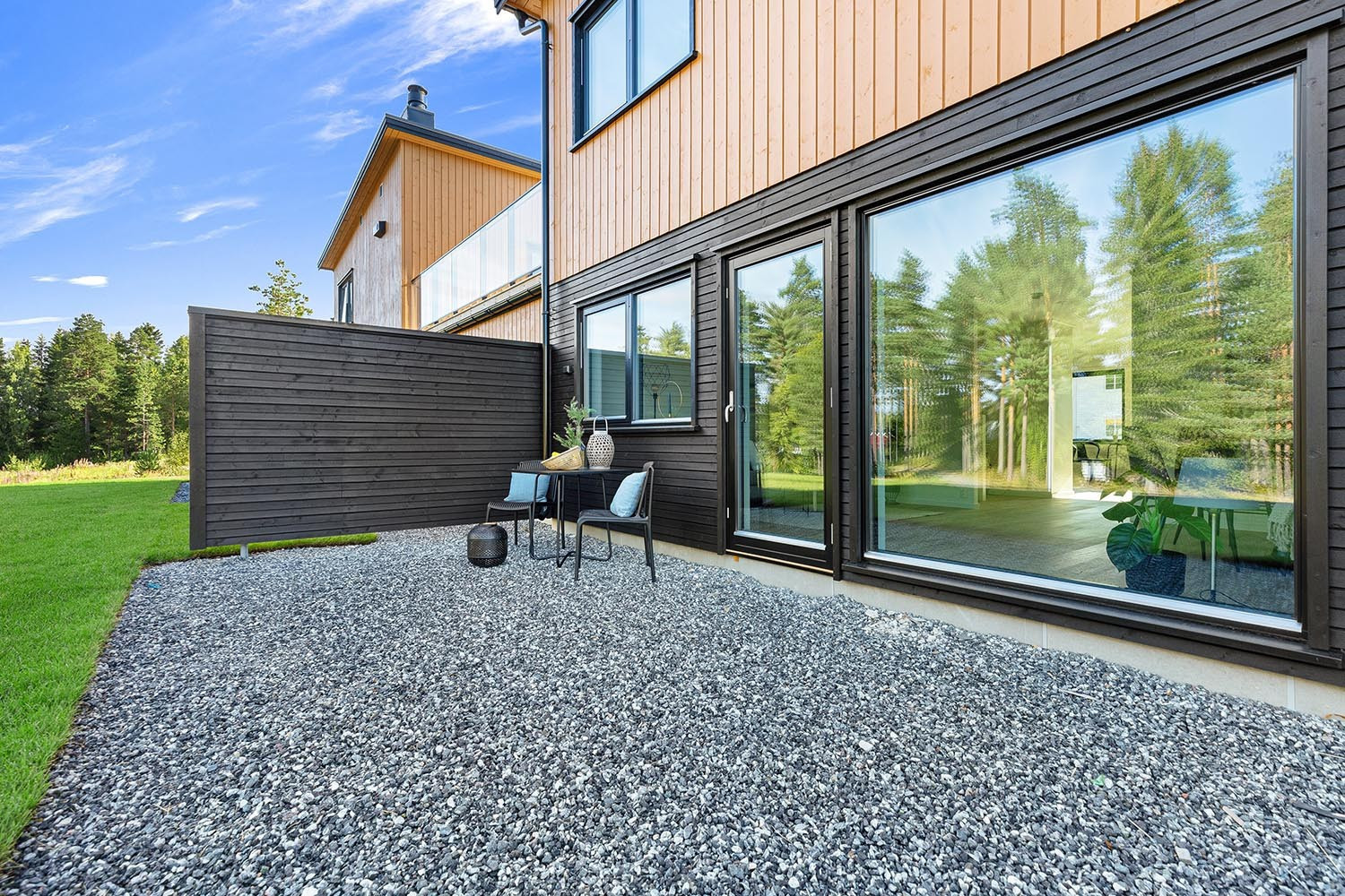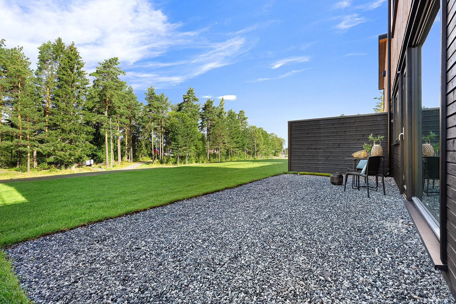 Flott, solrik hage ferdig opparbeidet med matjord og ferdigplen. Gruset område klargjort for å legge/bygge markterrasse.