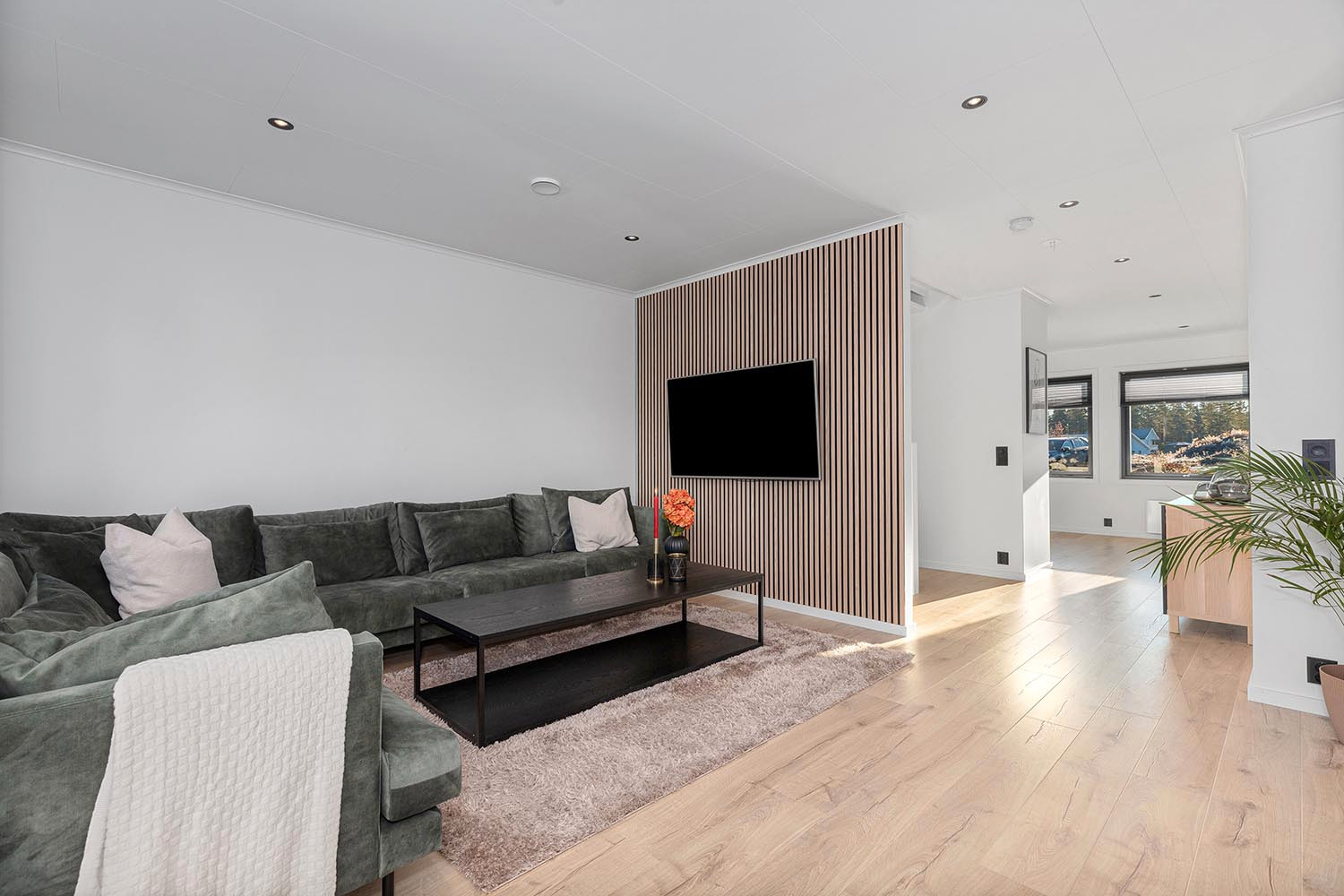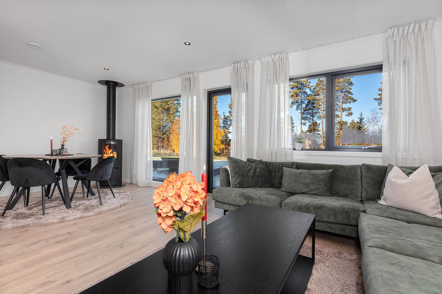 Stue: Romslig stue med moderne peisovn type VisionLine BLK 100 og utgang til solrik hage. Store vindusflater gjør stuen lys og trivelig. Det blir lagt ferdigplen og klargjort for markterrasse, men selve terrassen må man bekoste selv.