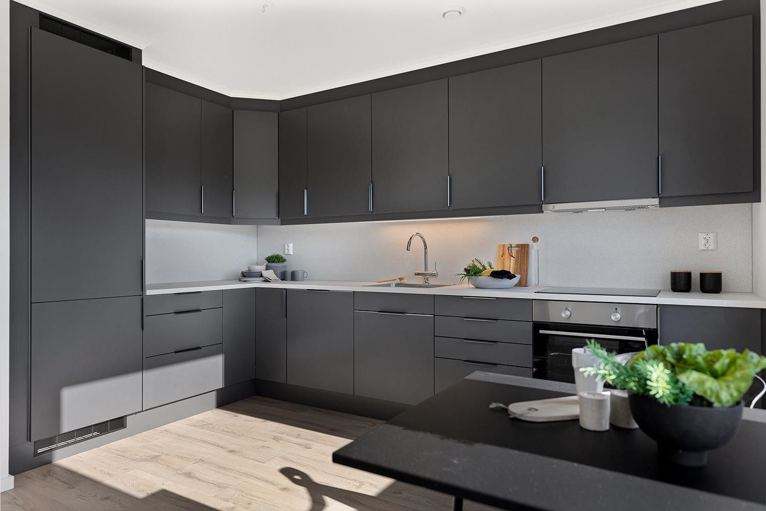 Kjøkken: Moderne, takhøy kjøkkeninnredning fra Sigdal, med Uno glatte, grå fronter, laminert benkeplate og kitchenboard, type "Hvit Levanto marmor" og håndtak type "Hekken" i børstet stål. Integrerte hvitevarer fra Electrolux bestående av koketopp, stekeovn, oppvaskmaskin og kombiskap. Koselig spiseplass ved vindu.
