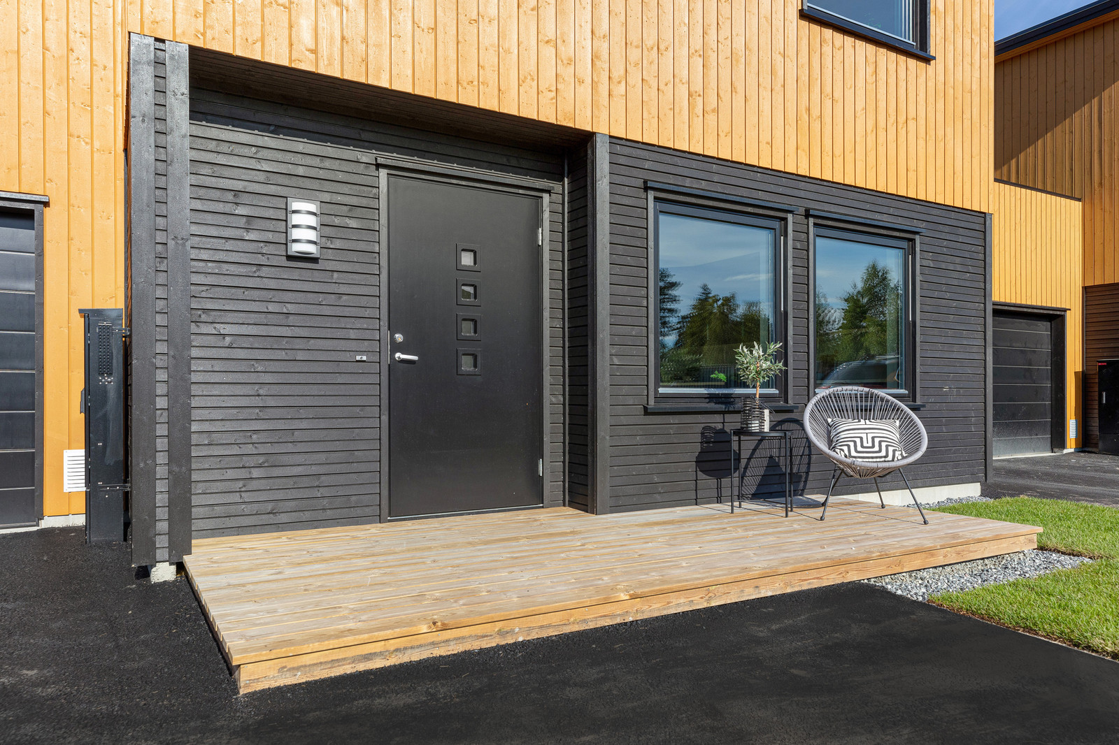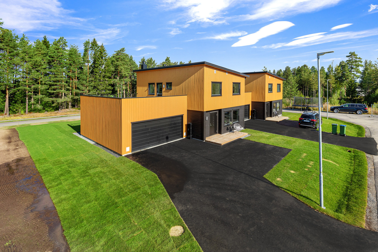 Boligene er bygget sammen to og to i kjede, adskilt med hver sin store dobbel garasje og sportsbod. Utvendig leveres boligene med sort takpapp. Kledningen leveres ferdig grunnet med toppstrøk av maler.